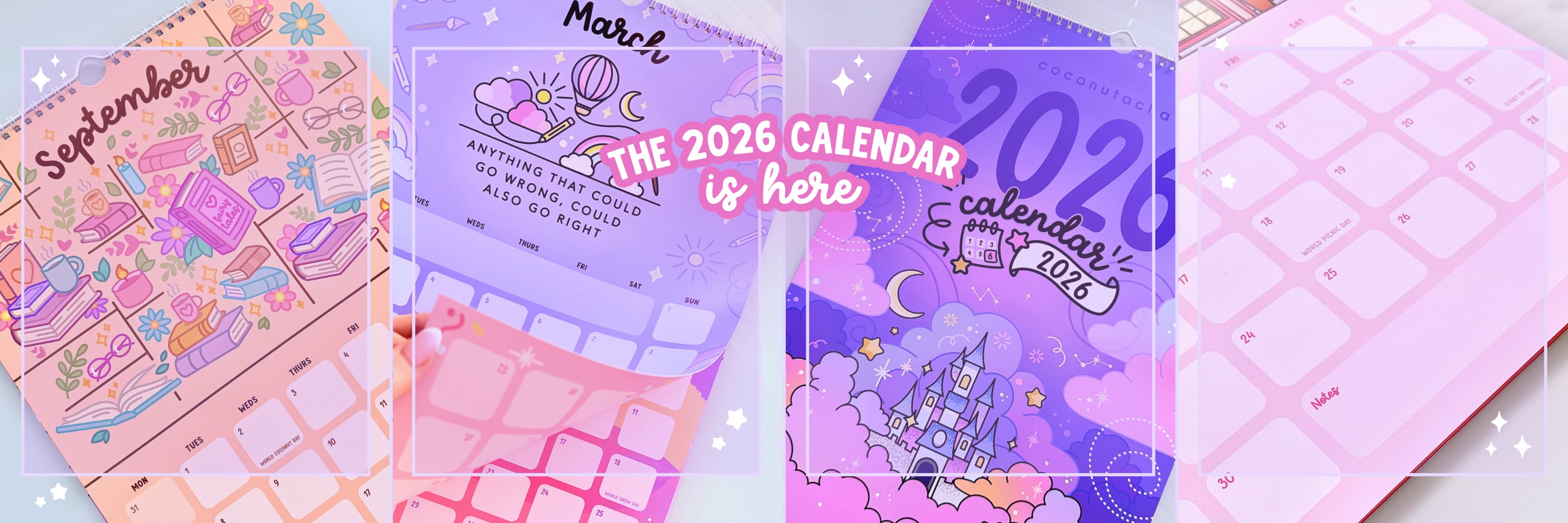 Introducing the official CoconuTacha 2026 Wall Calendar! Featuring 12 original illustrations to represent each month. Map out your year and add a pop of bright colour and cuteness to your office or studio!