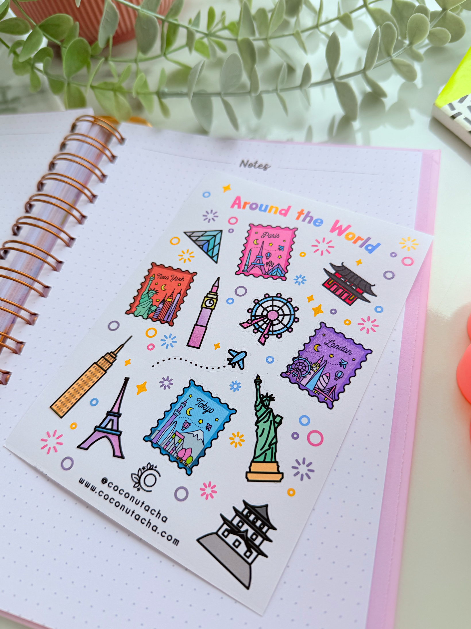 Take a little trip across the globe with the Around the World Sticker Sheet, illustrated by me and inspired by my love of travel, postcards, and faraway adventures!