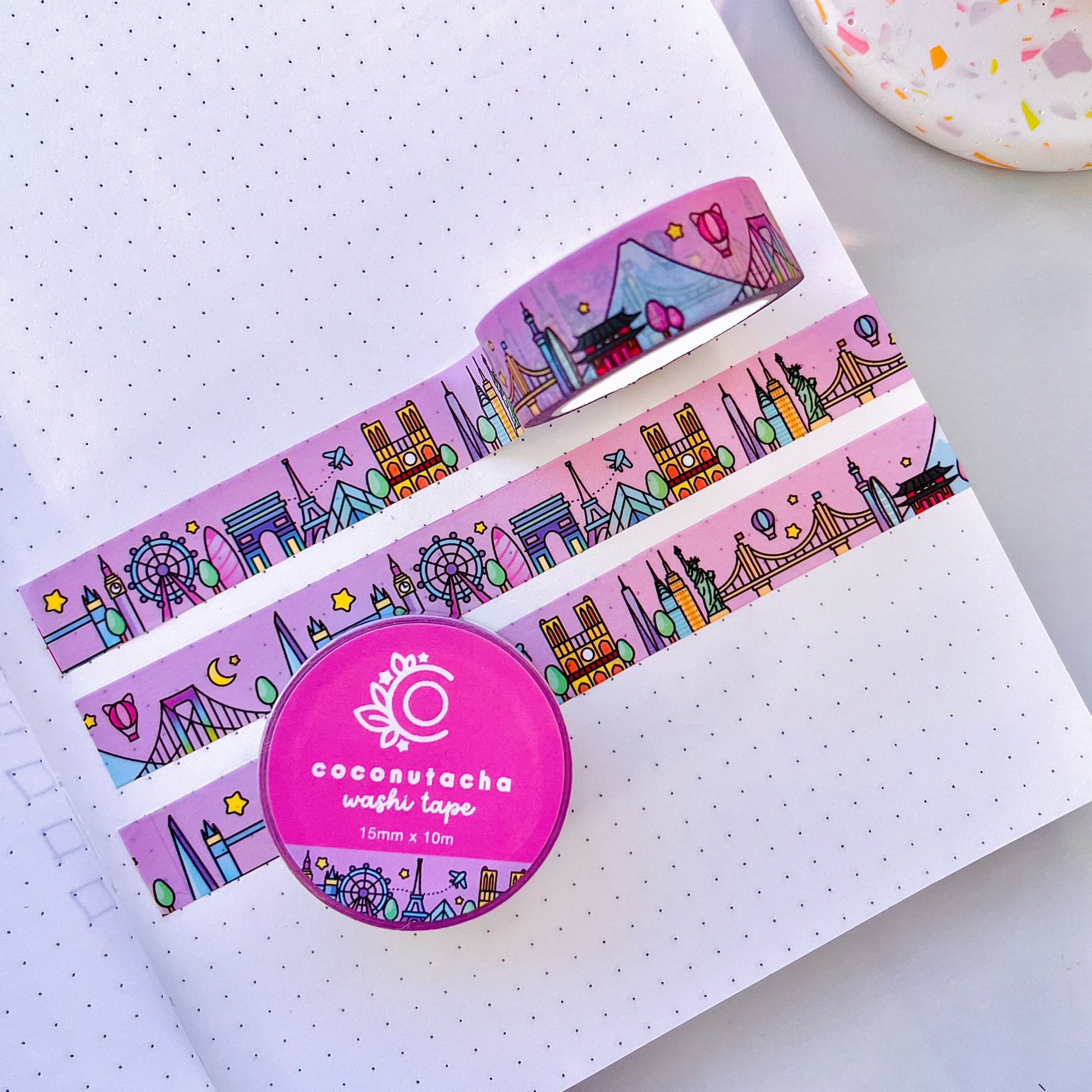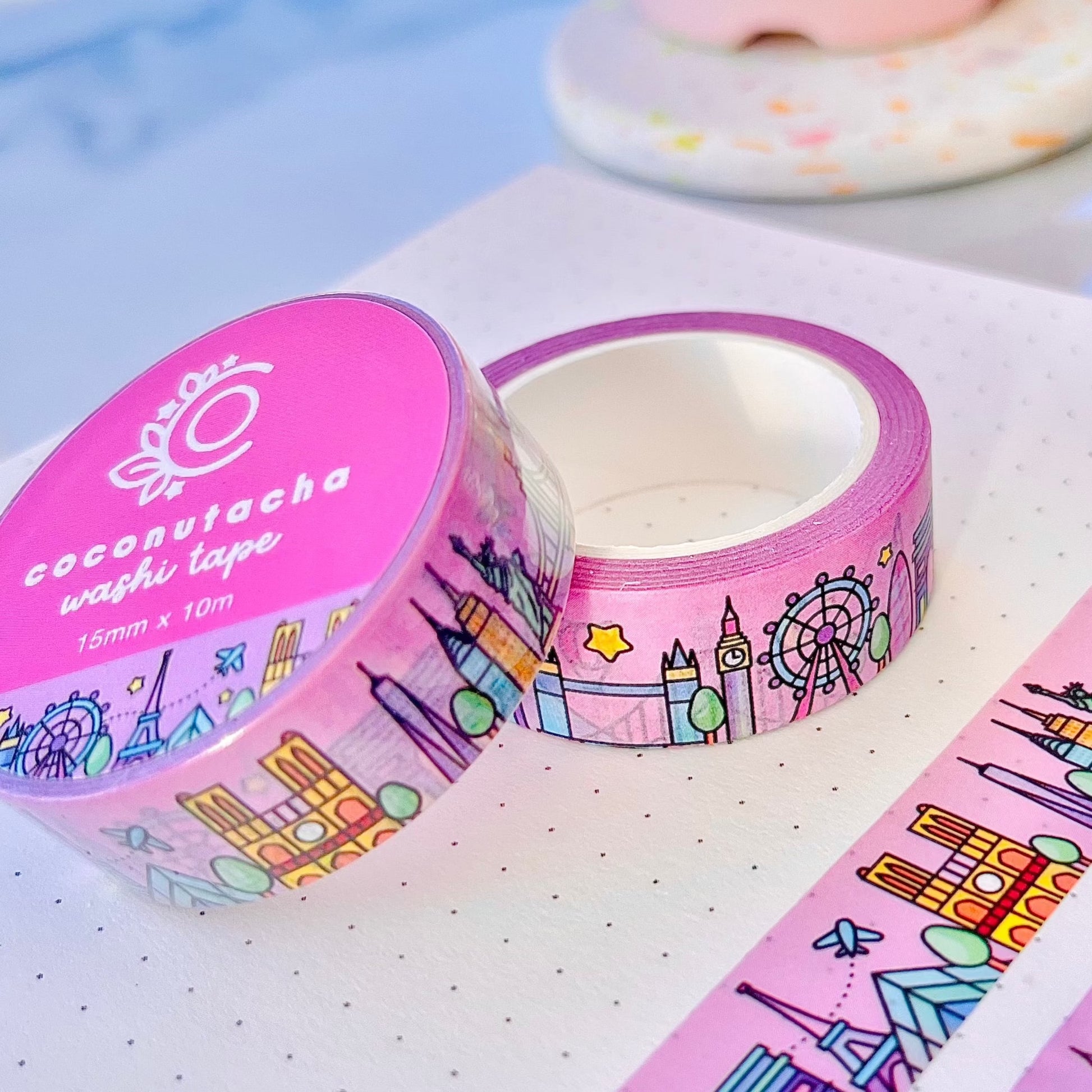 Spice up your journal with our Around the World Washi Tape! Explore London, Tokyo, Paris, and New York with this quirky pink tape featuring iconic landmarks like the Eiffel Tower and Mount Fuji. Perfect for all your bujo and stationery needs. Bon voyage!
