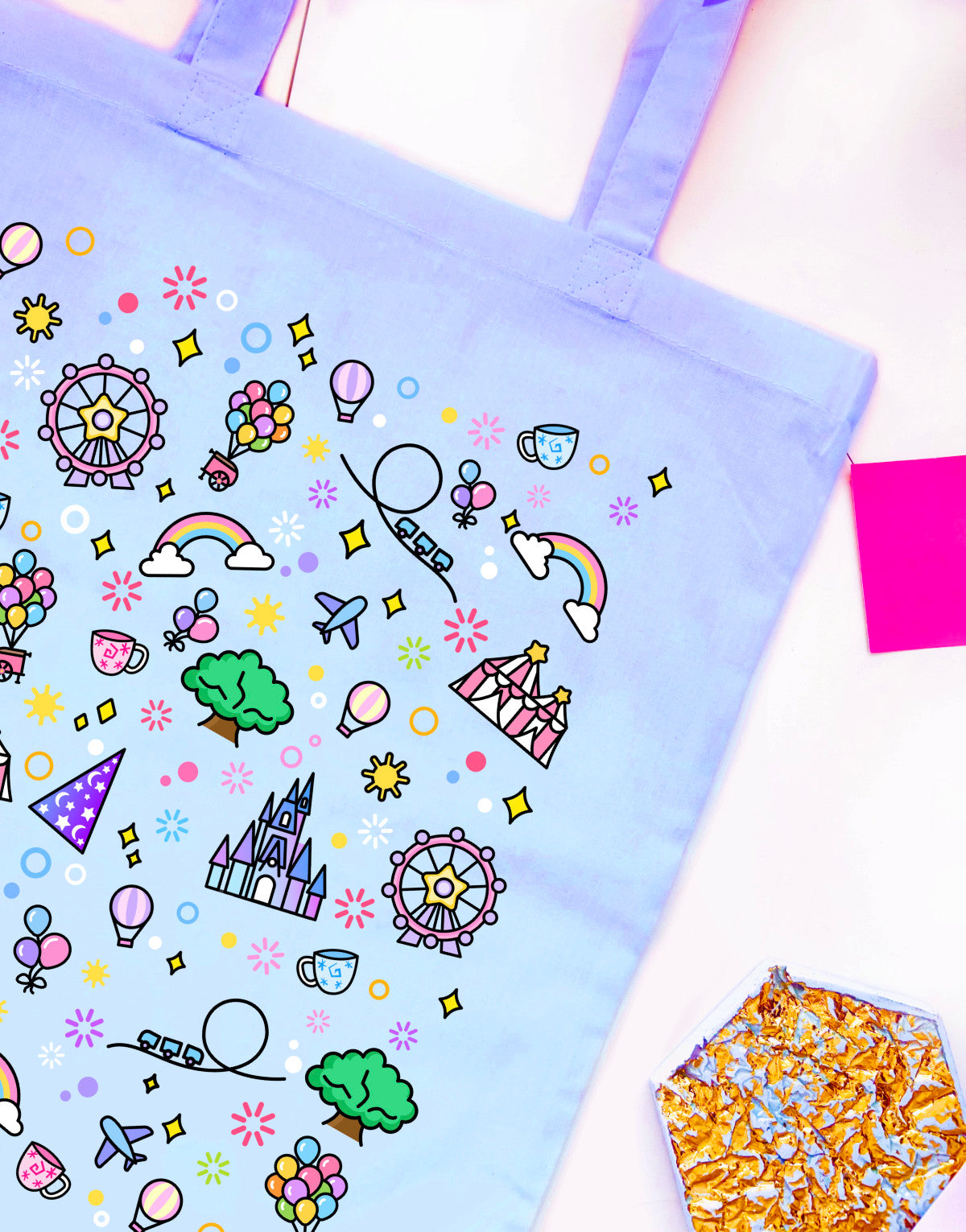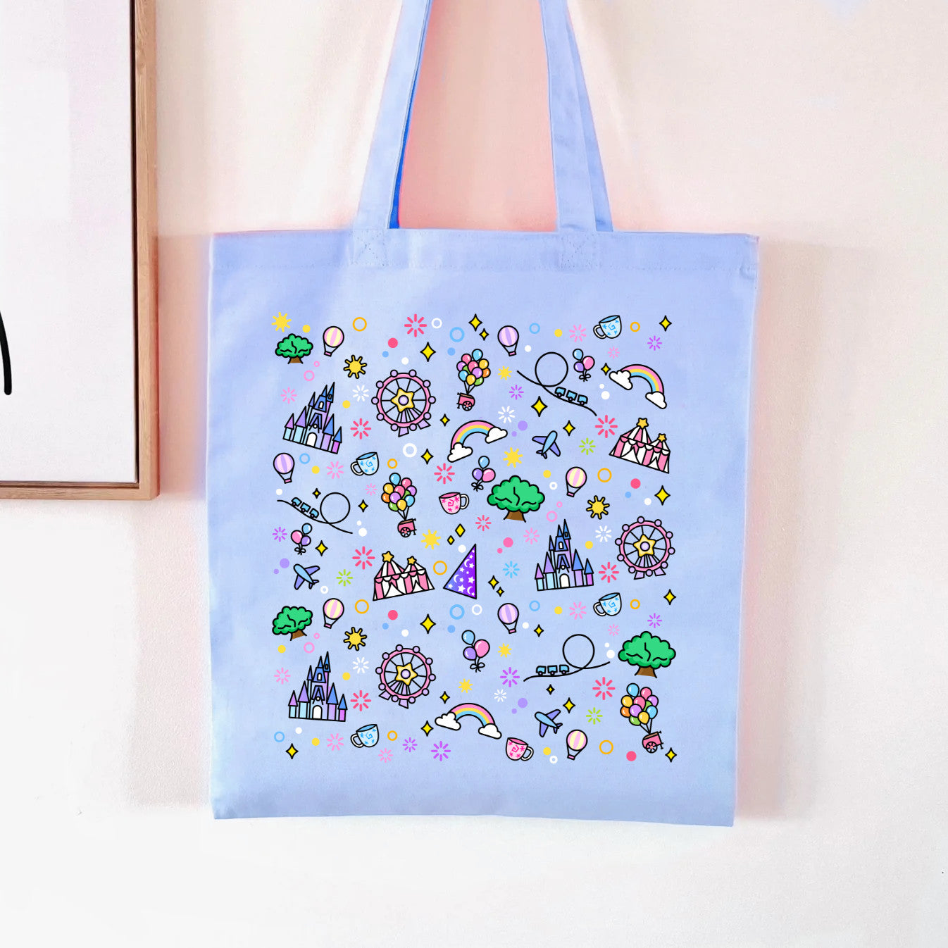 Bring a touch of magic with you wherever you go with this blue Happy Place tote bag! Featuring a colourful design inspired by magical theme parks, this tote is perfect for travellers and dreamers. Made with durable fabric, it’s great for daily use or carrying all your theme park essentials. Perfect for those who love unique, happy designs with a touch of nostalgia. Makes a great gift for anyone who loves to show off their happy place!