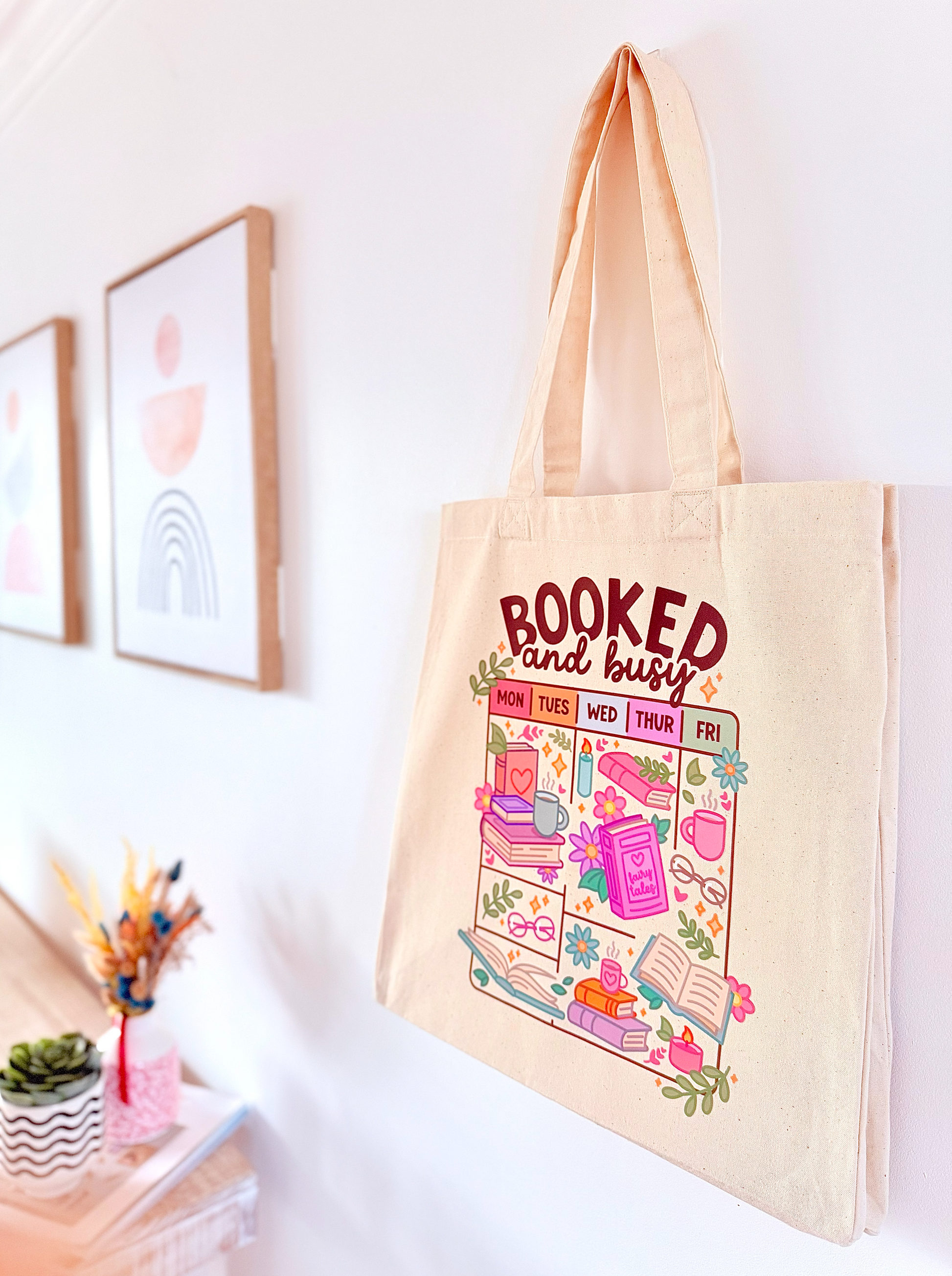 This extra roomy Booked & Busy tote bag is made from durable, high-quality 100% cotton canvas with strong handles and a flat base to hold all your essentials. Whether you're heading to the library, the post office or just bringing three books “just in case,” this tote has your back.