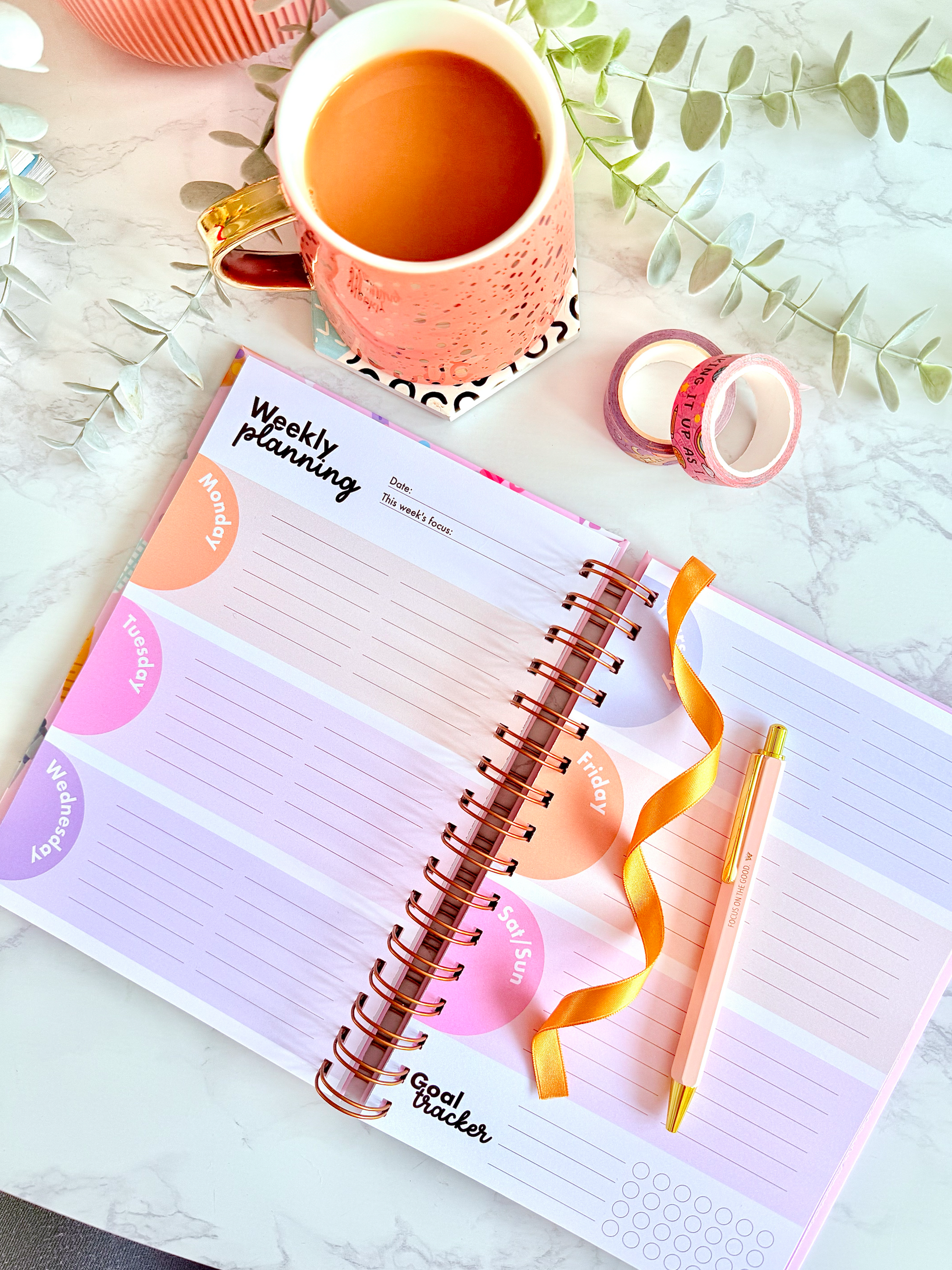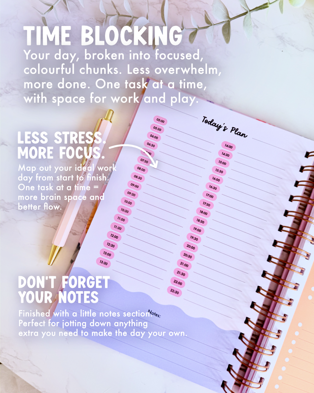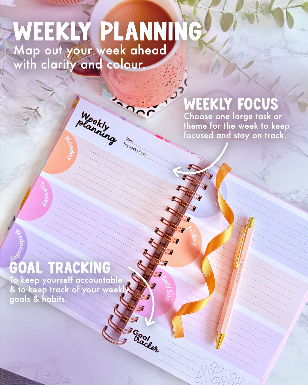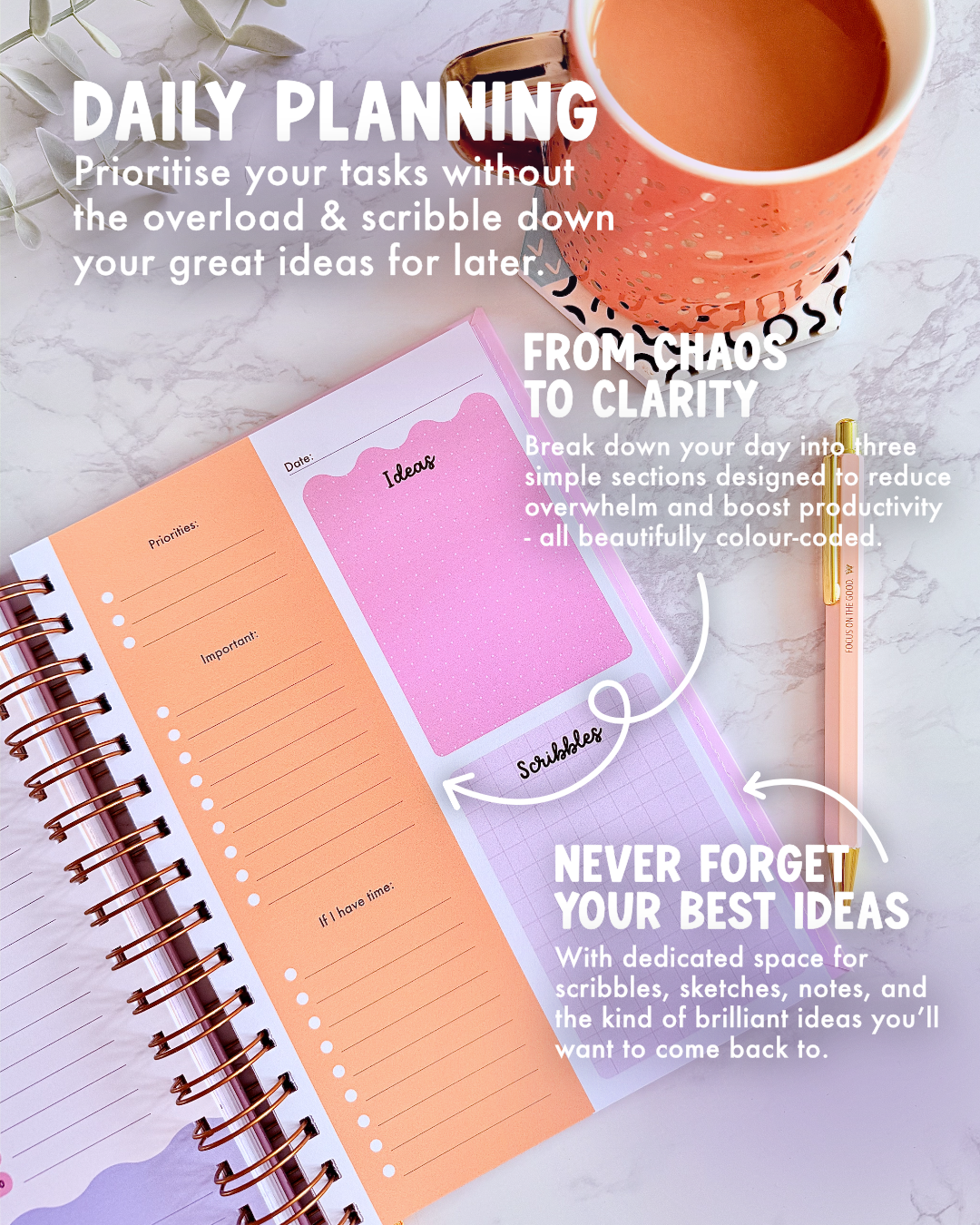 This planner is undated, which means no wasted pages. No pressure. Just vibes (and big plans). Missed a week? Took a break? Went off-grid for a bit? No worries. Just pick up where you left off. With space to plan, prioritise and scribble down those genius ideas you get at 11pm, this planner has got you covered from the start of the day to the very end.