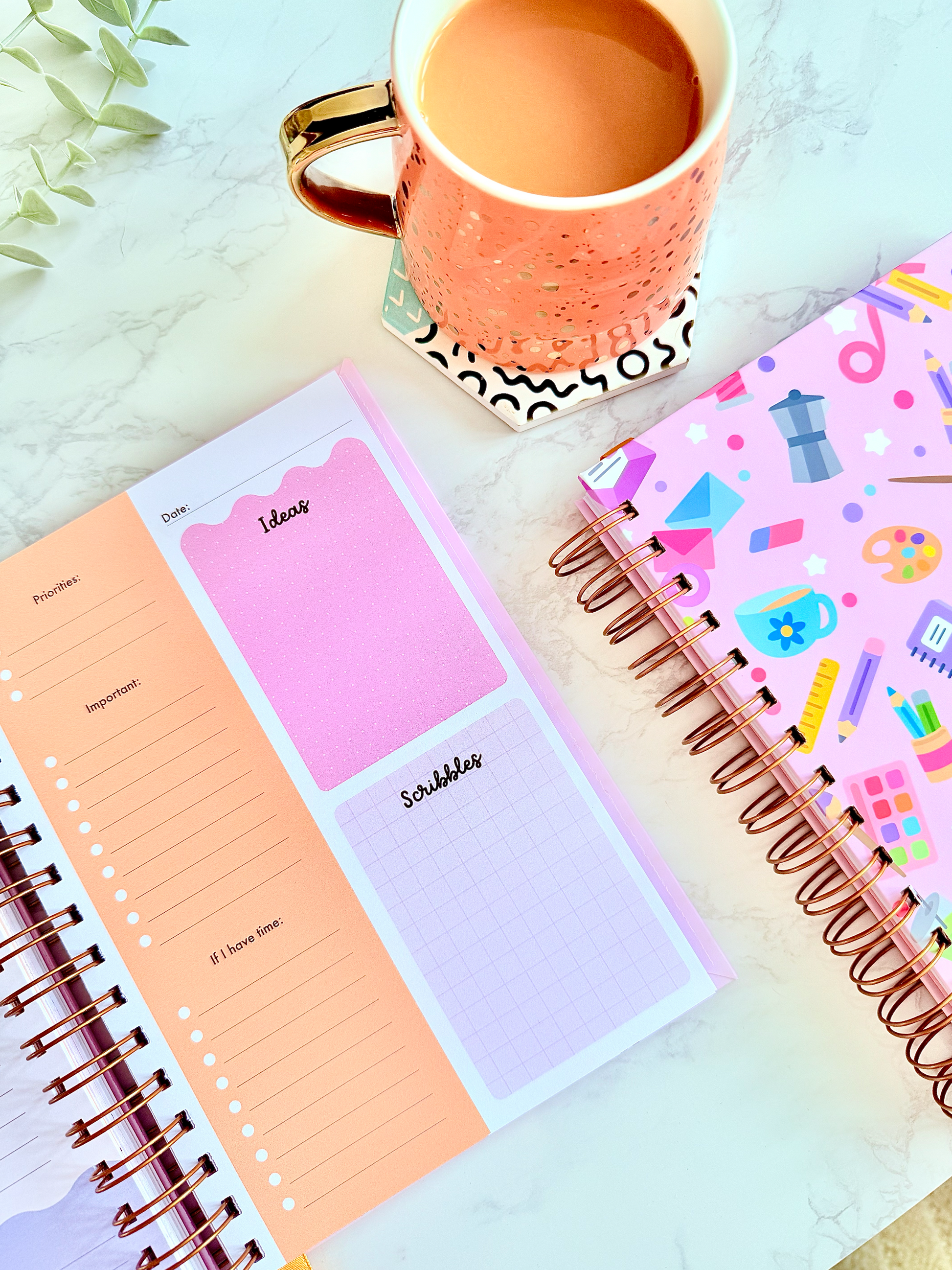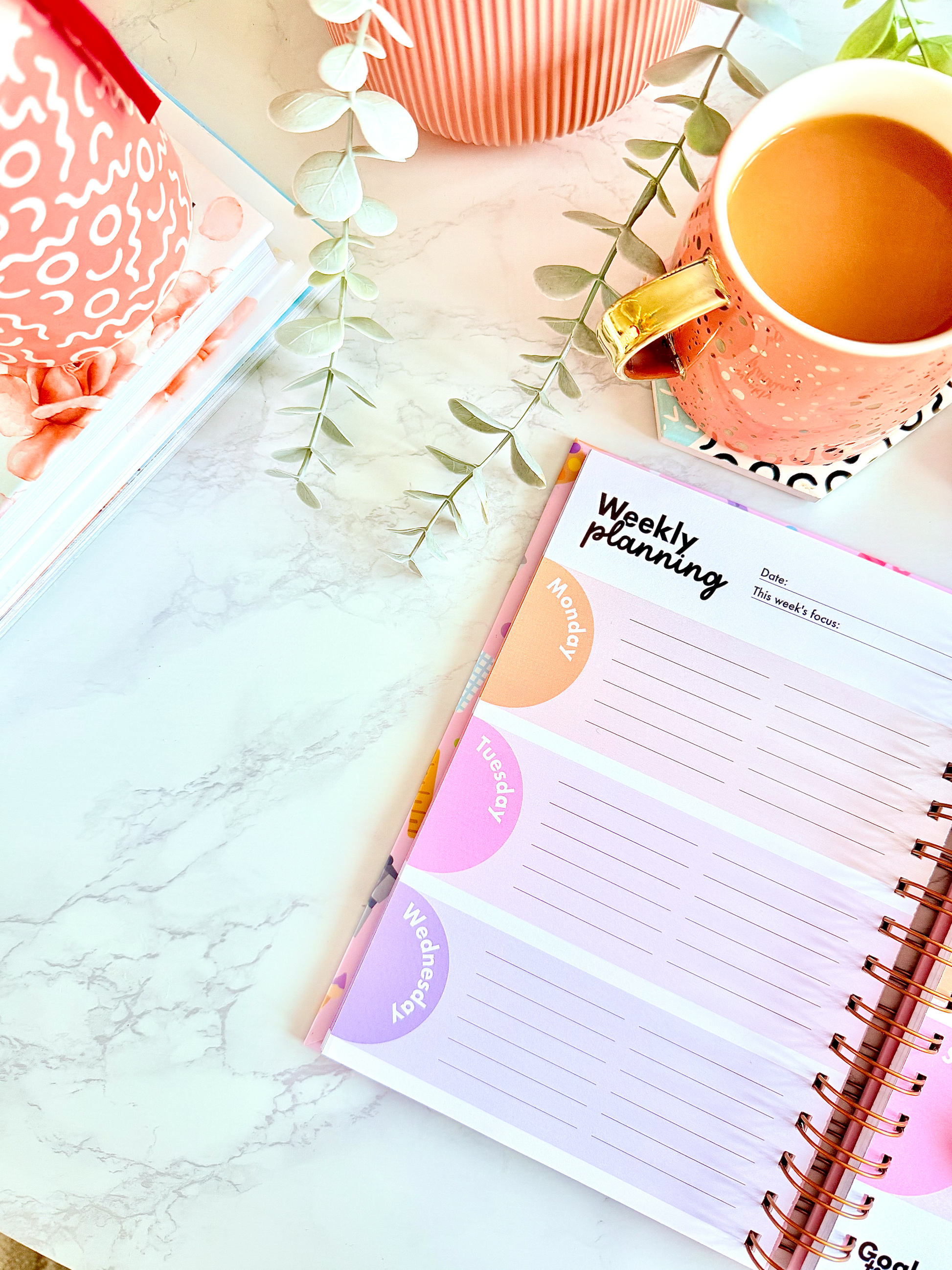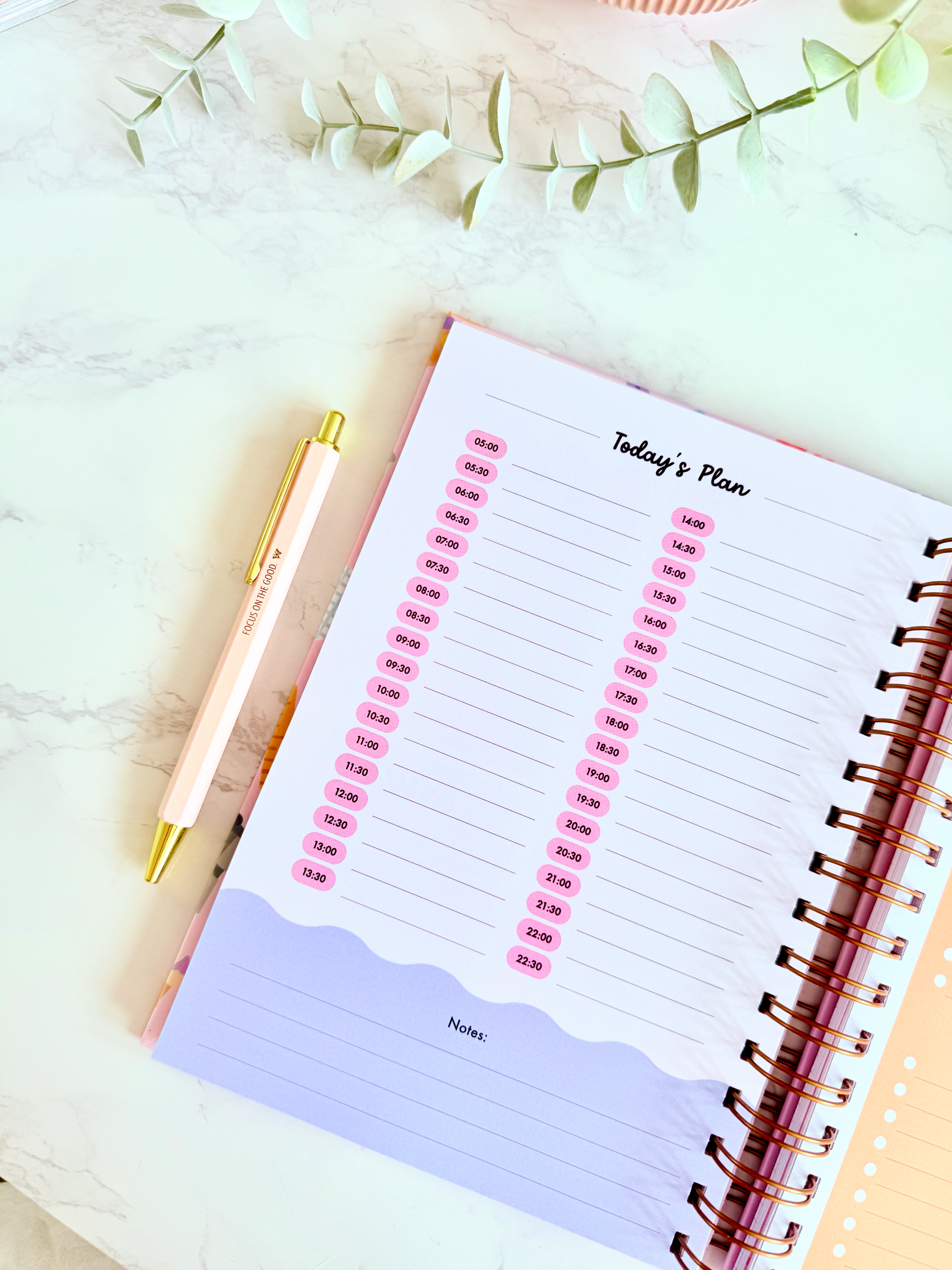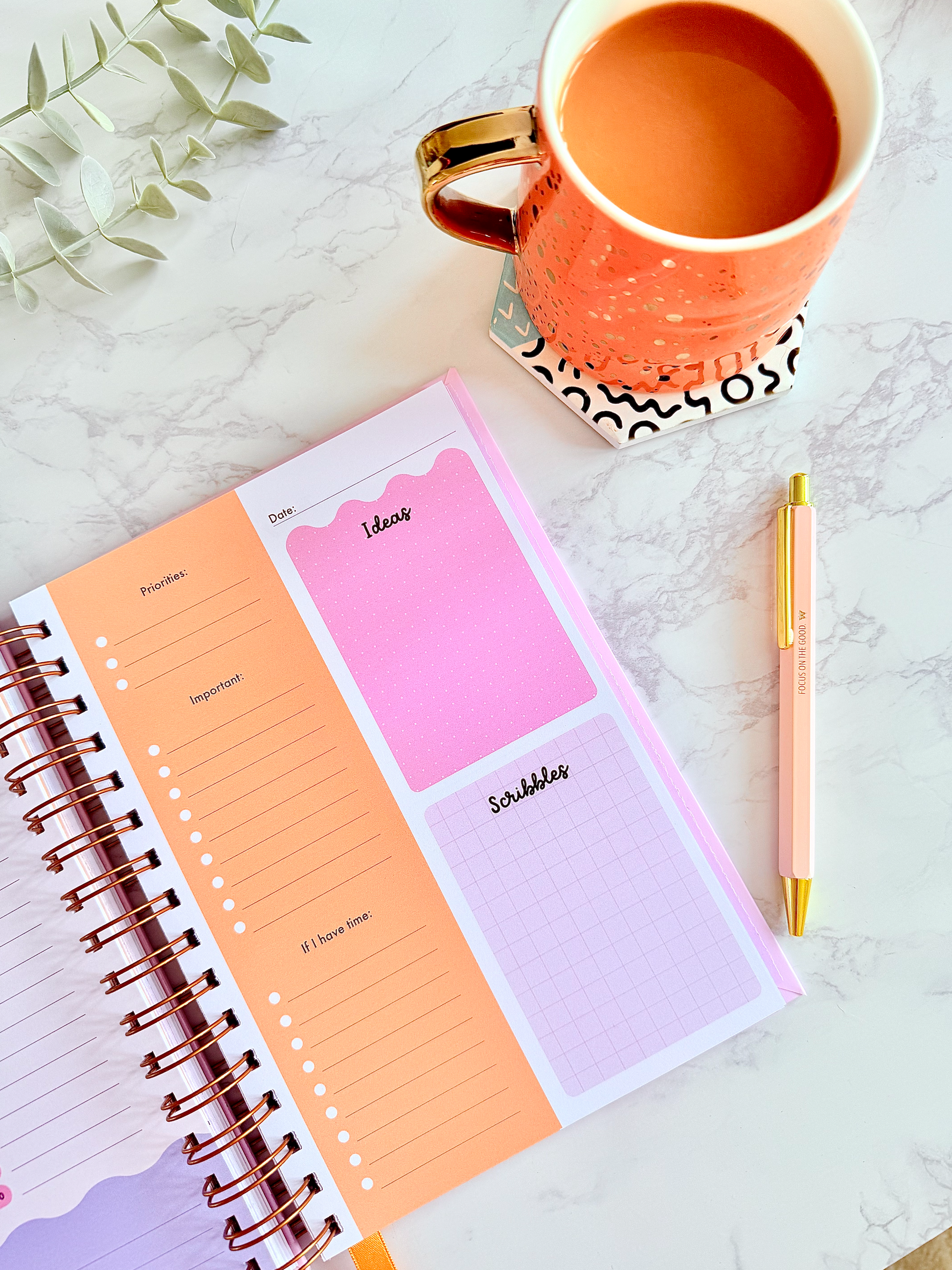 This planner is undated, which means no wasted pages. No pressure. Just vibes (and big plans). Missed a week? Took a break? Went off-grid for a bit? No worries. Just pick up where you left off. With space to plan, prioritise and scribble down those genius ideas you get at 11pm, this planner has got you covered from the start of the day to the very end.