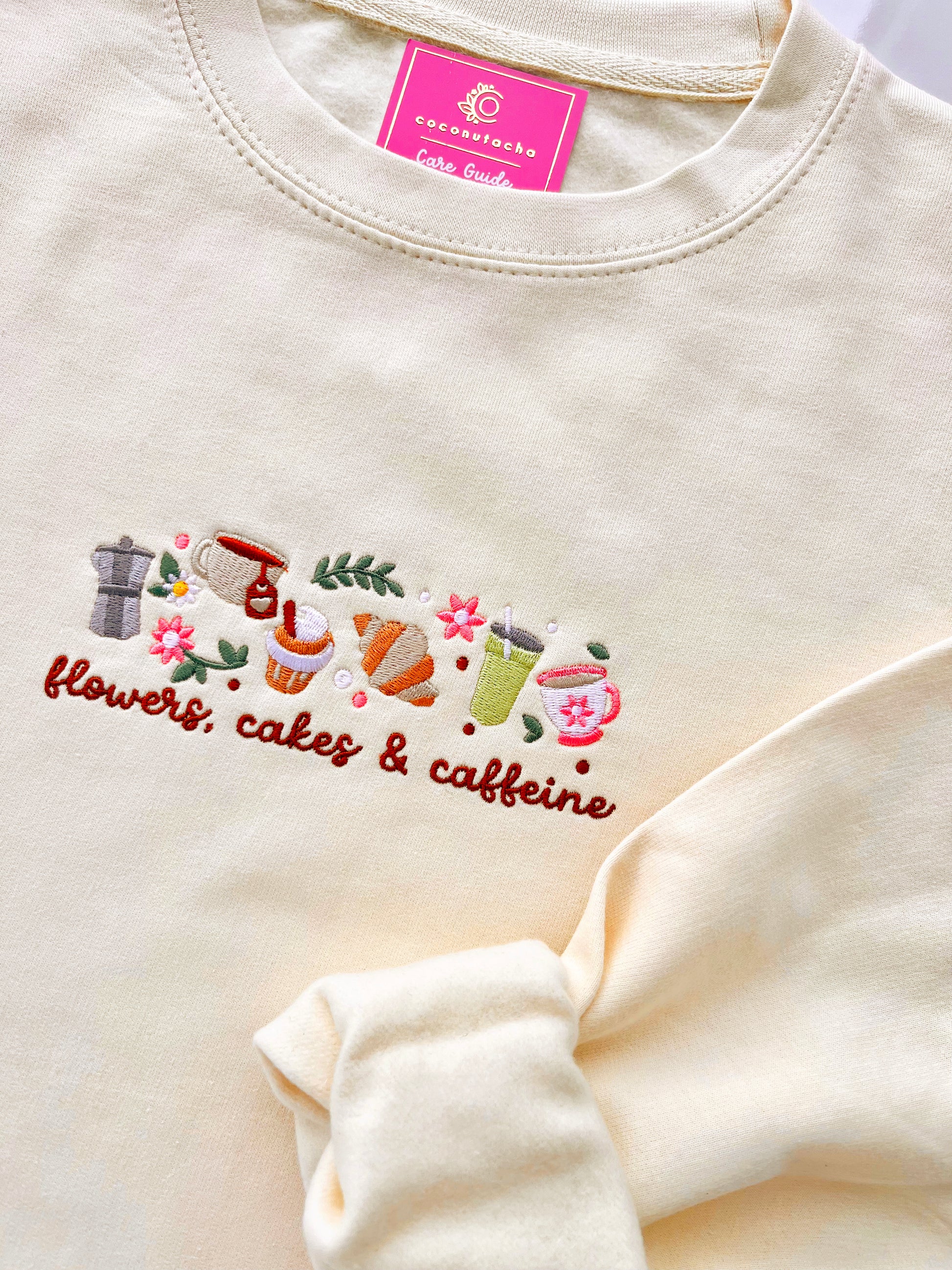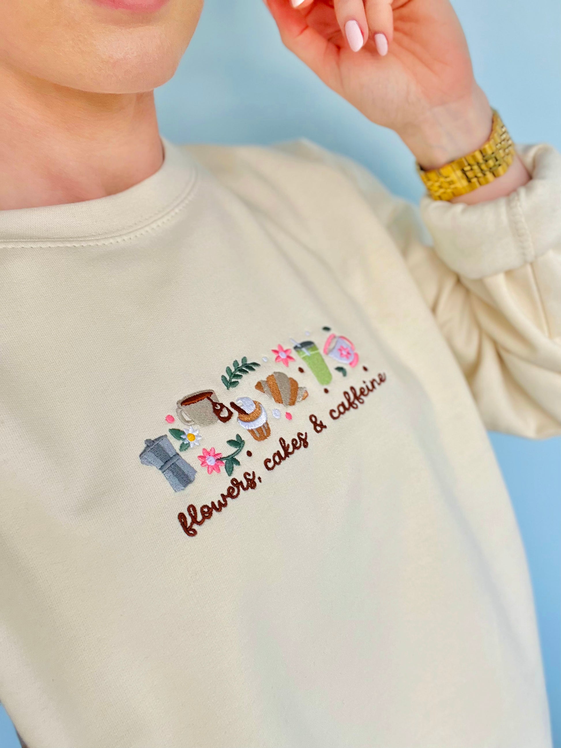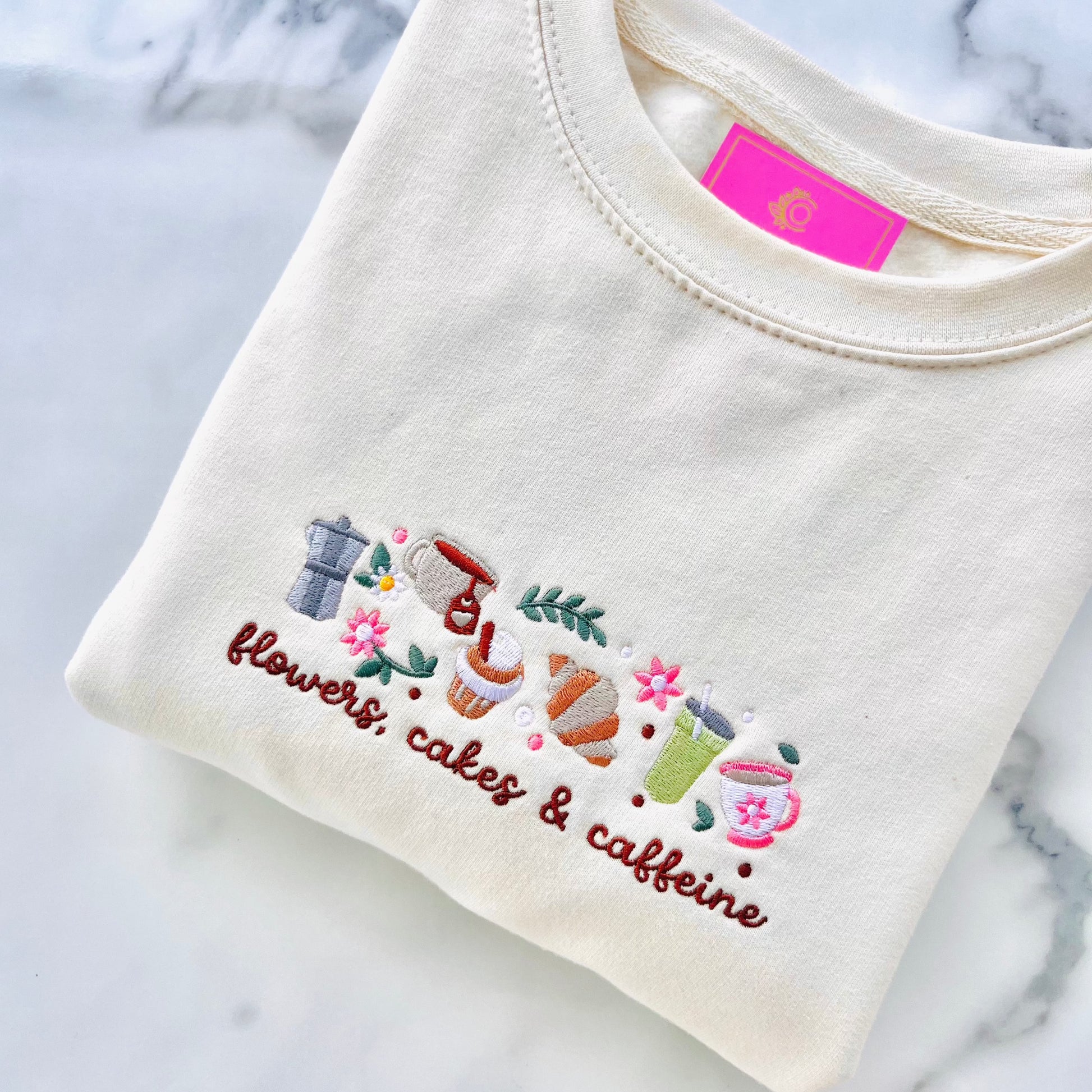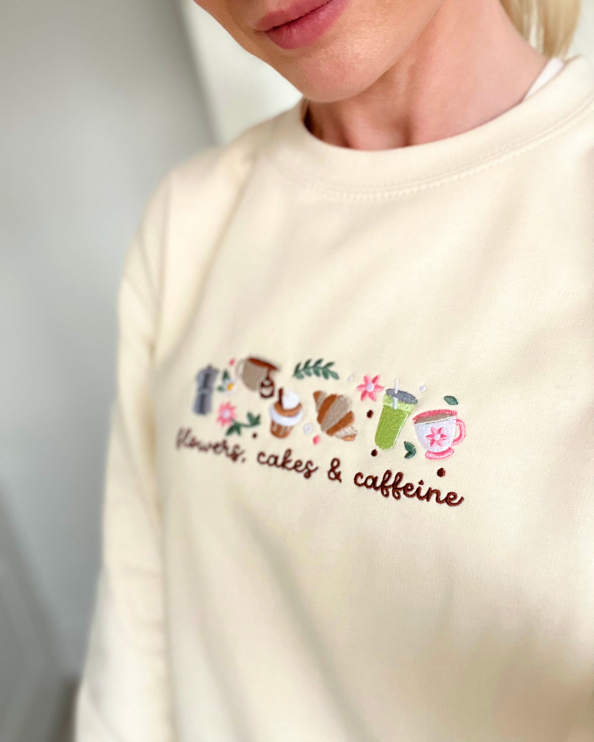 Introducing the highly-anticipated Flowers, Cakes & Caffeine sweater, delicately embroidered onto a delicious vanilla milkshake colour. Don't forget to pair it with your favorite caffeinated beverage (I've got something to help with that 😉) for an extra boost of energy.