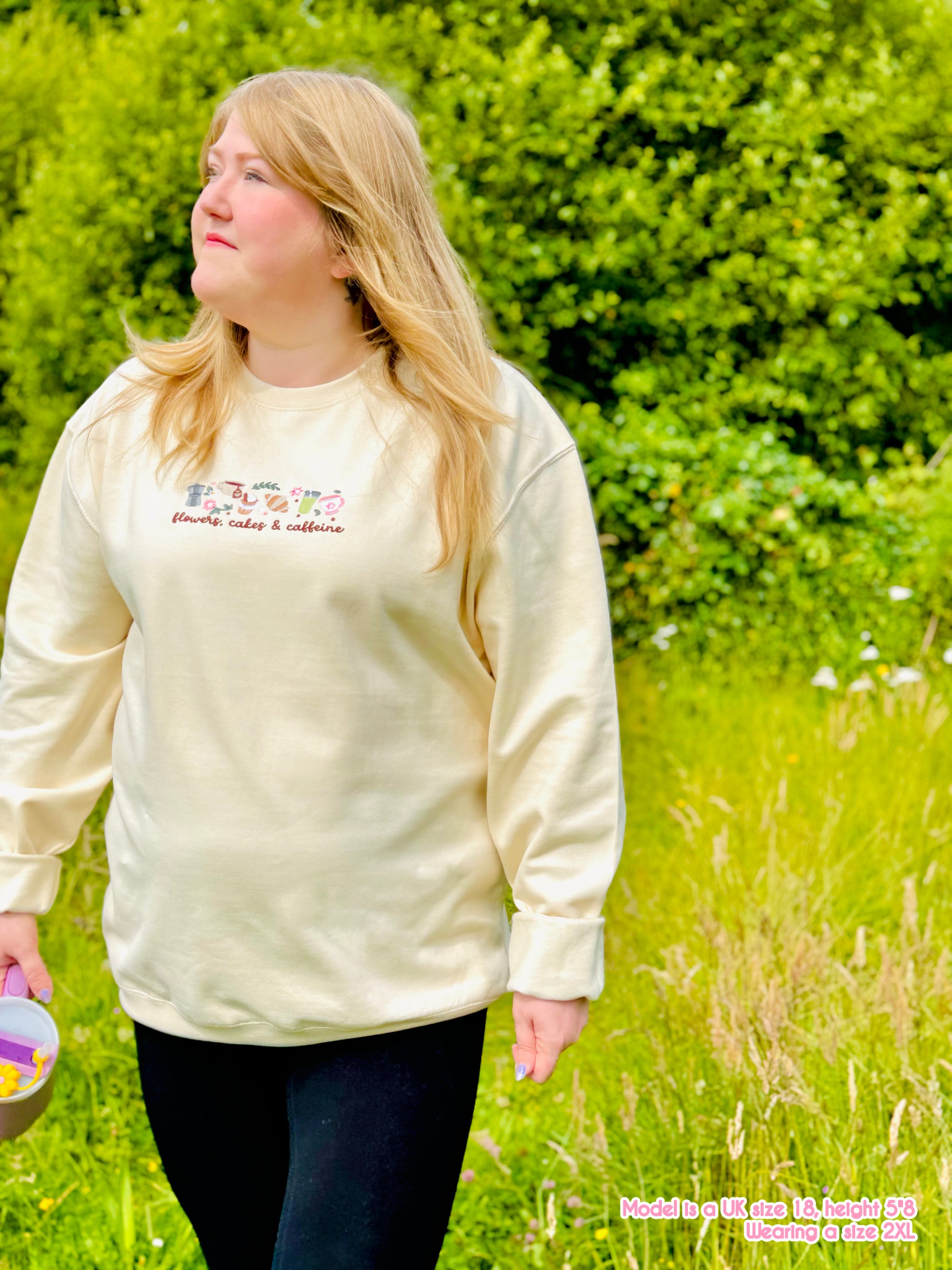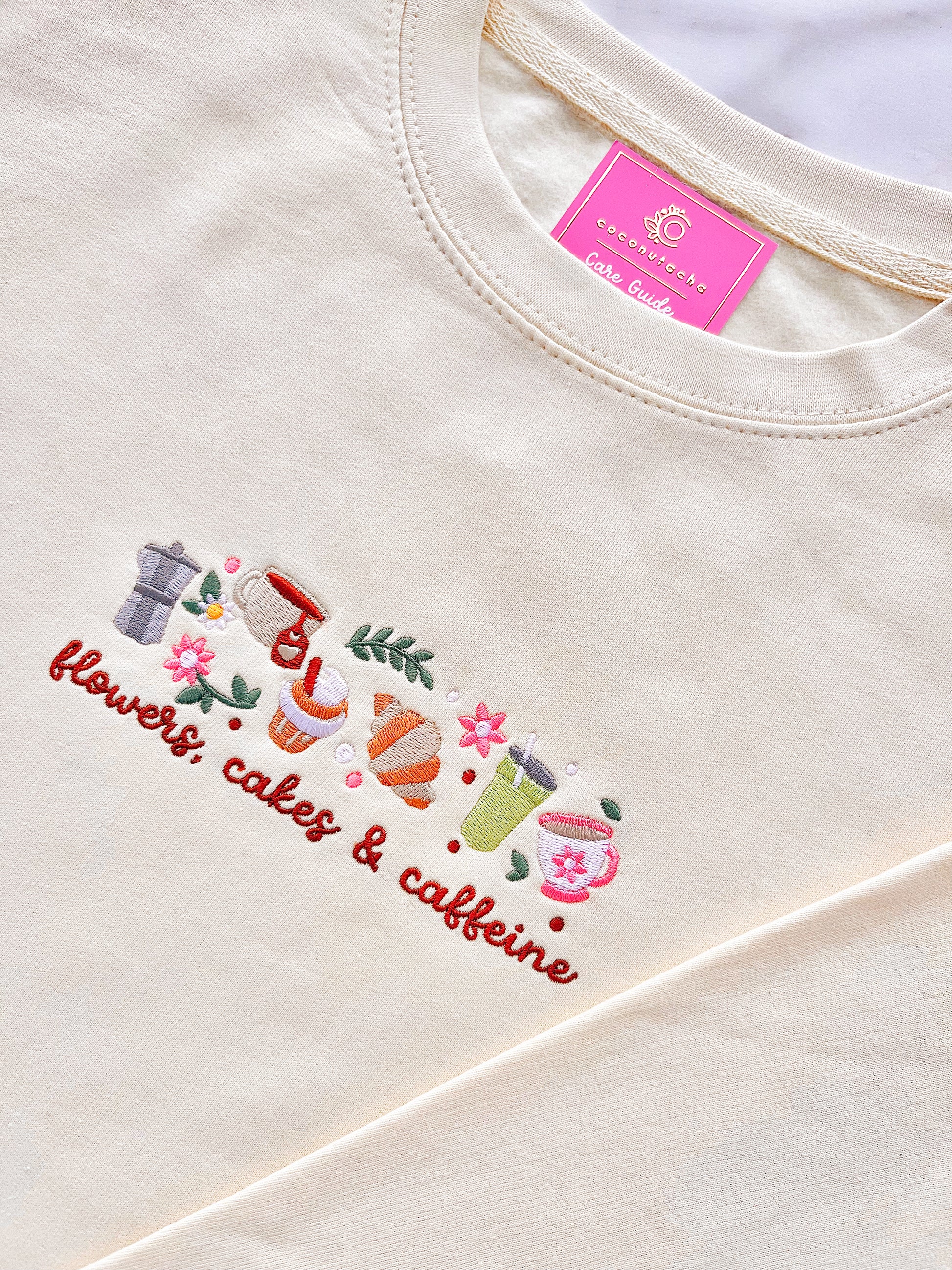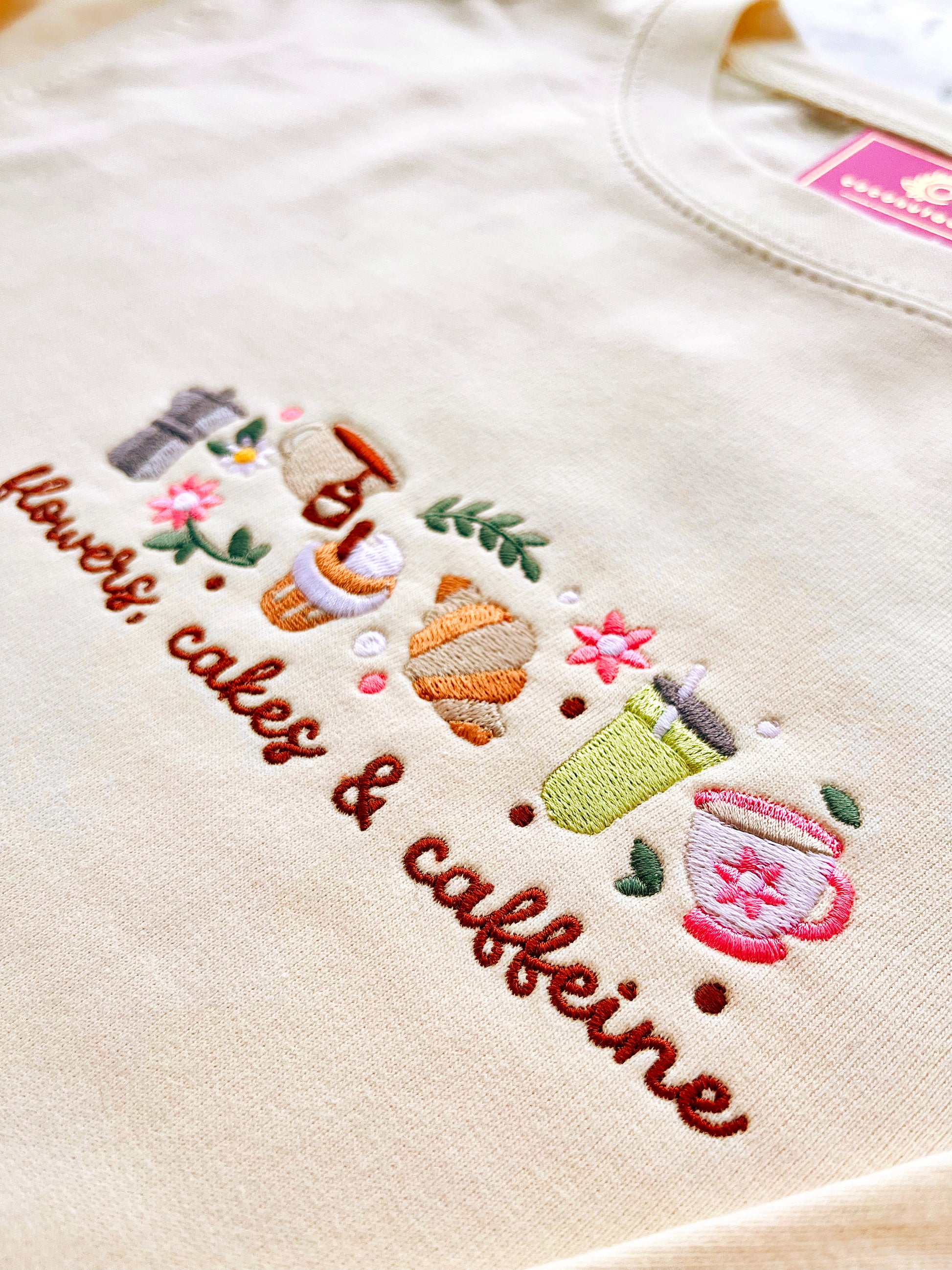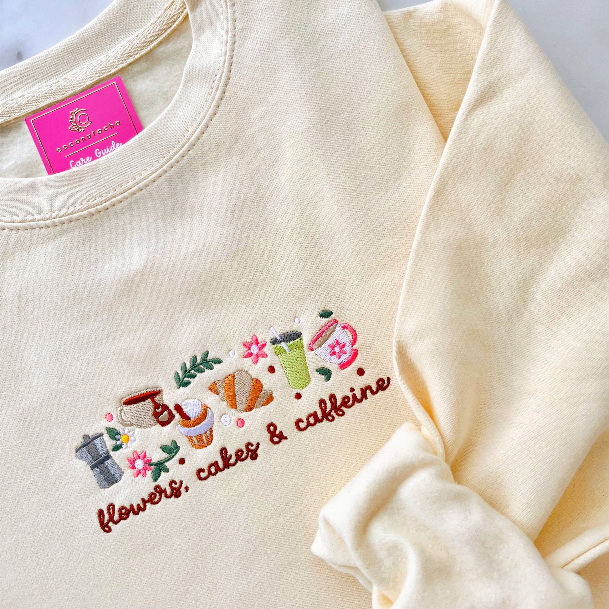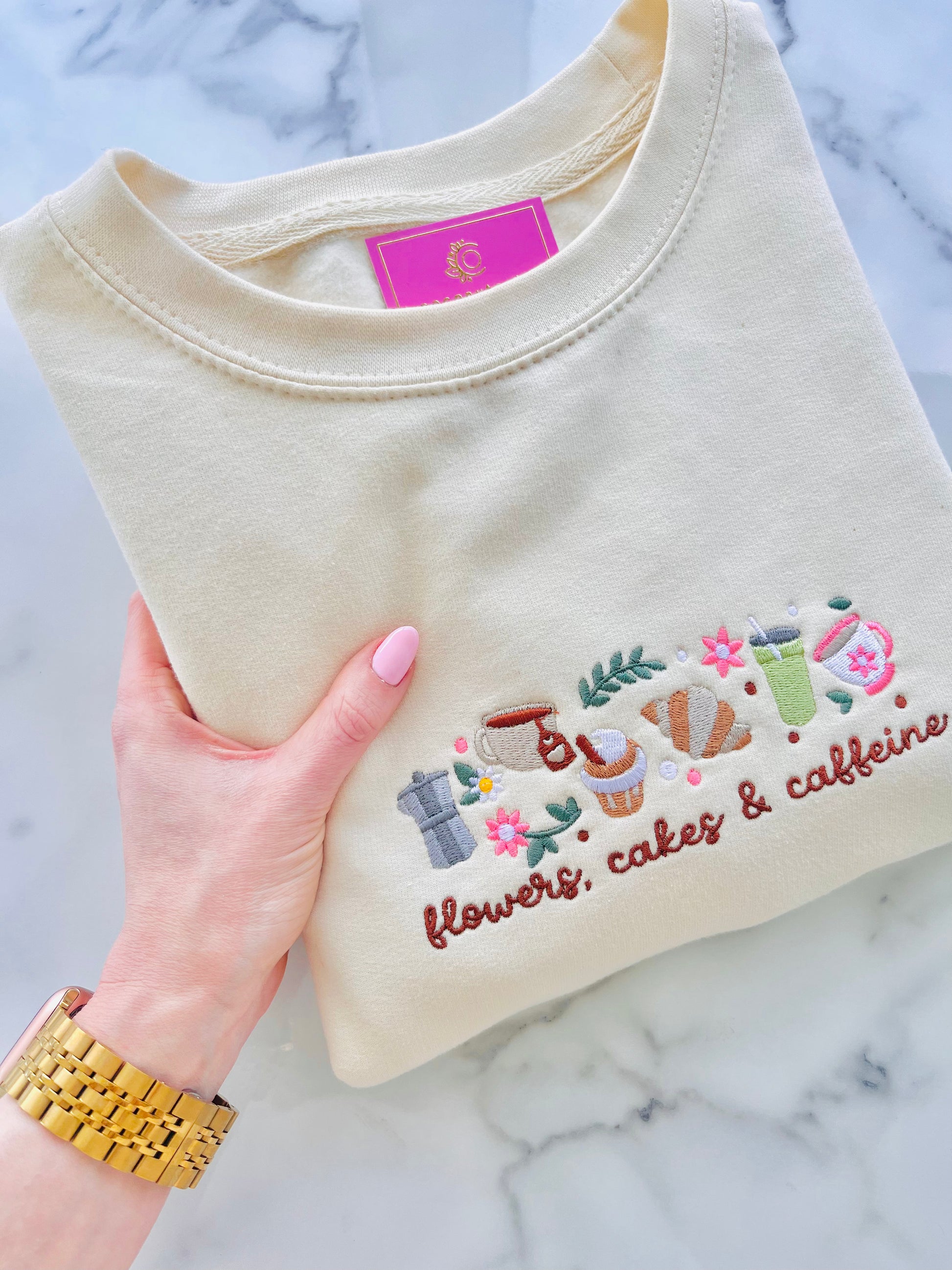 Introducing the highly-anticipated Flowers, Cakes & Caffeine sweater, delicately embroidered onto a delicious vanilla milkshake colour. Don't forget to pair it with your favorite caffeinated beverage (I've got something to help with that 😉) for an extra boost of energy.