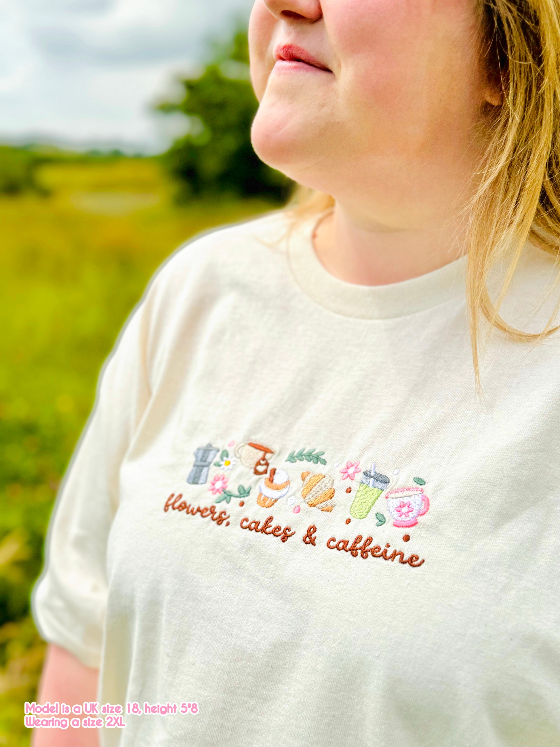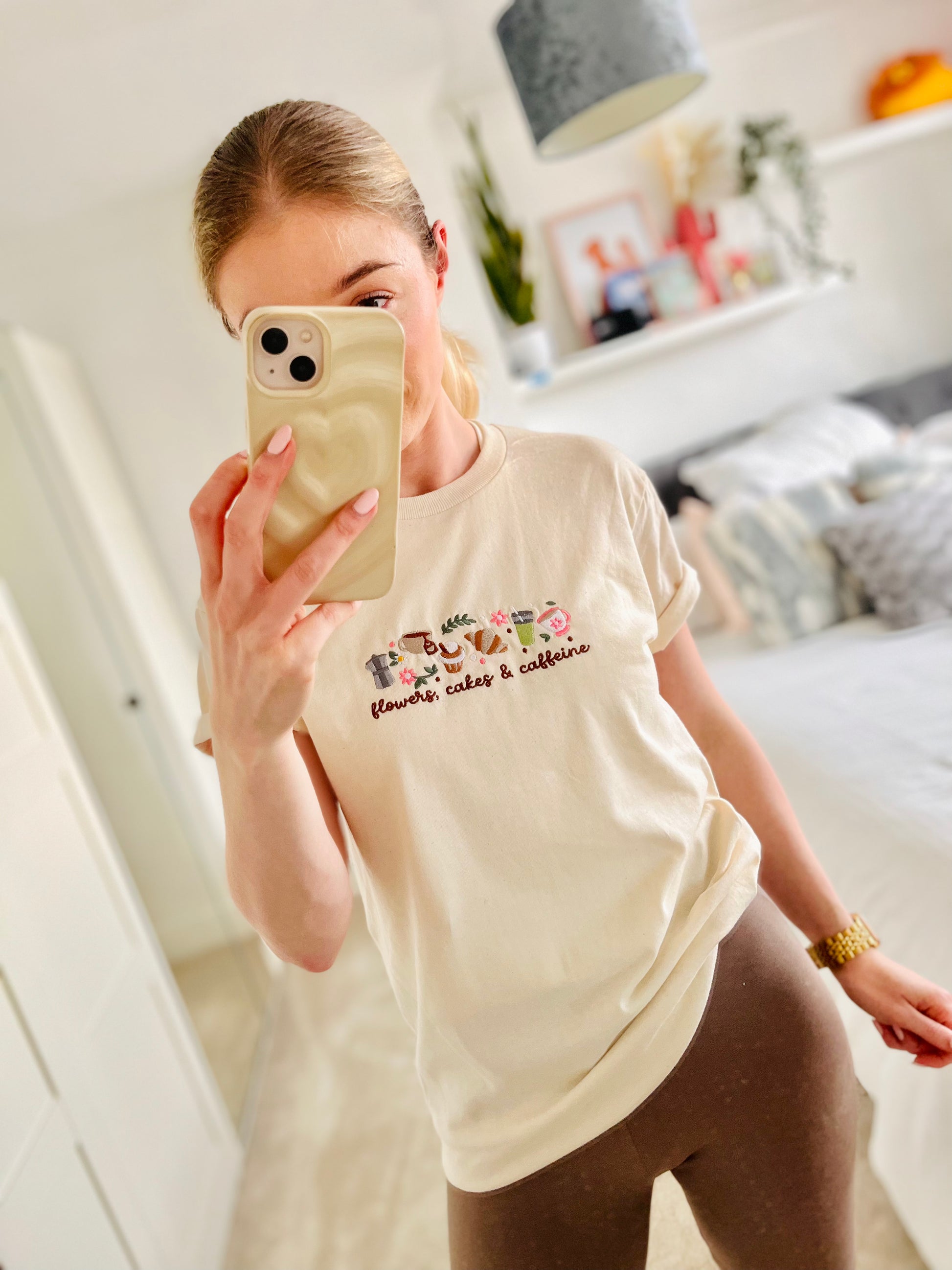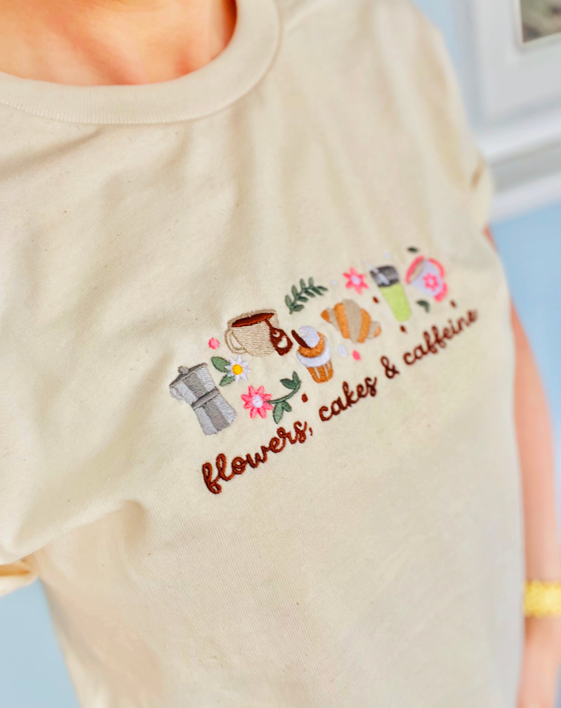 Say hello to your new favourite tee for the warmer months! The Flowers, Cakes & Caffeine embroidered t-shirt is a comfy longline fit, designed to be both flattering and relaxed. It’s delicately embroidered with three of life’s greatest joys – tea, coffee, and matcha – surrounded by dreamy florals and sweet treats like cupcakes and pastries 🧁