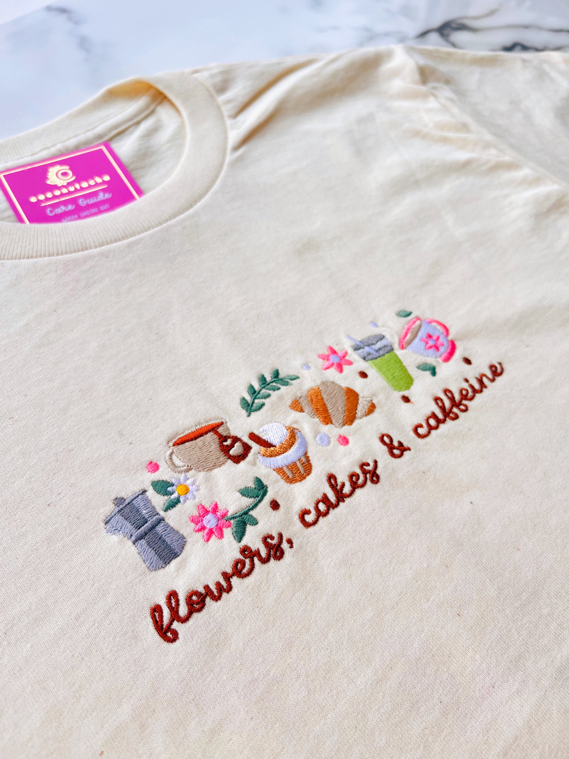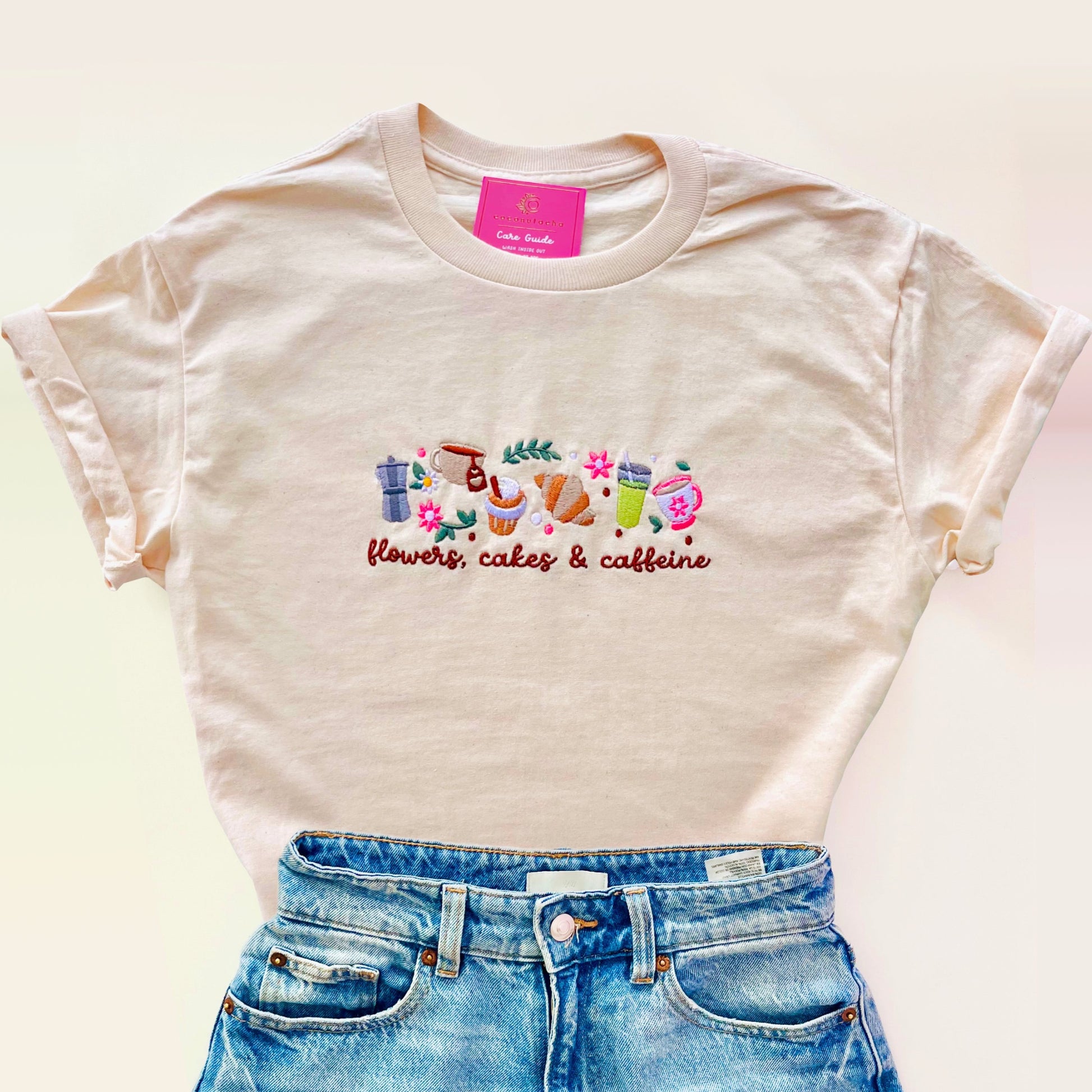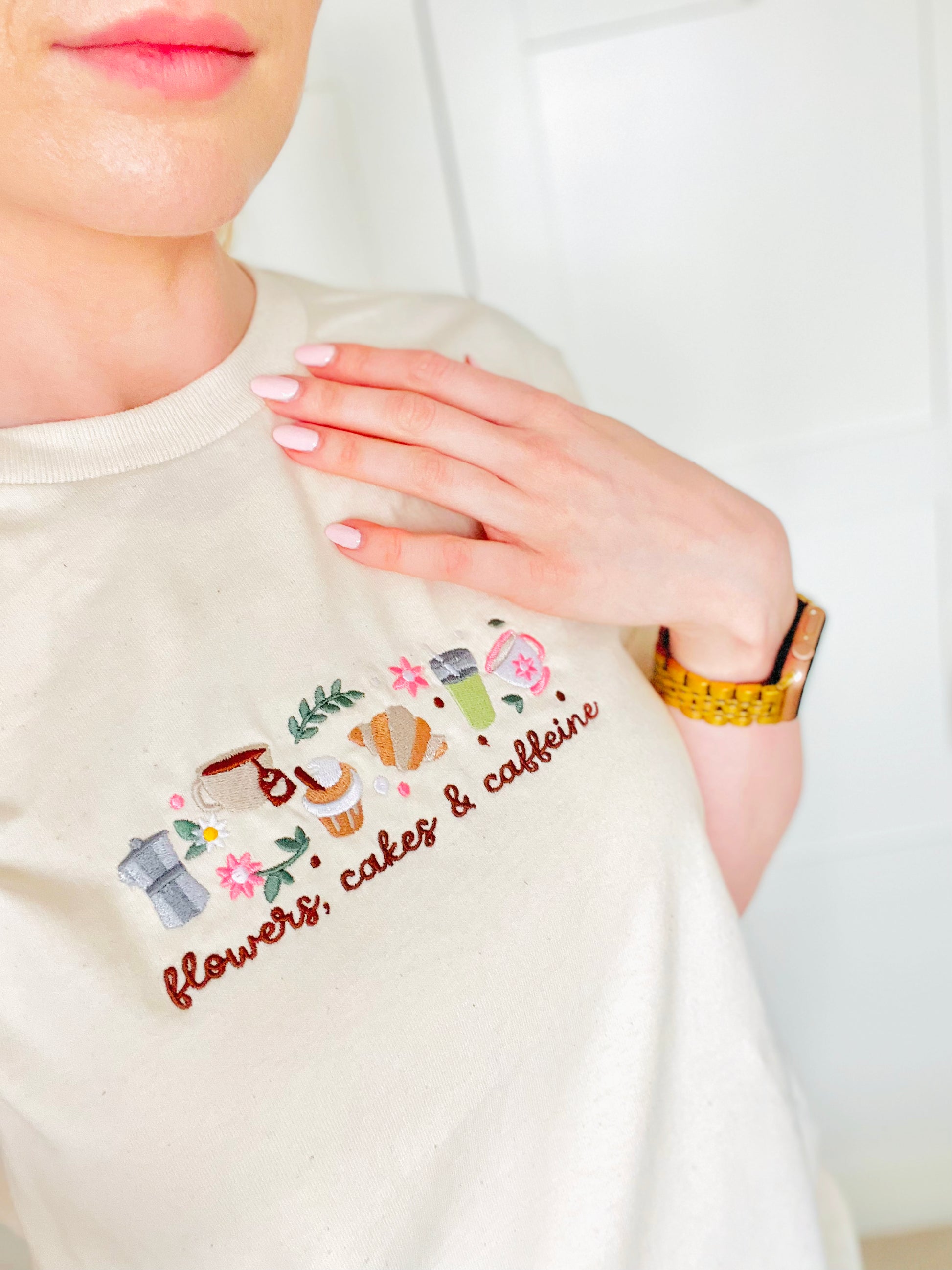 Say hello to your new favourite tee for the warmer months! The Flowers, Cakes & Caffeine embroidered t-shirt is a comfy longline fit, designed to be both flattering and relaxed. It’s delicately embroidered with three of life’s greatest joys – tea, coffee, and matcha – surrounded by dreamy florals and sweet treats like cupcakes and pastries 🧁