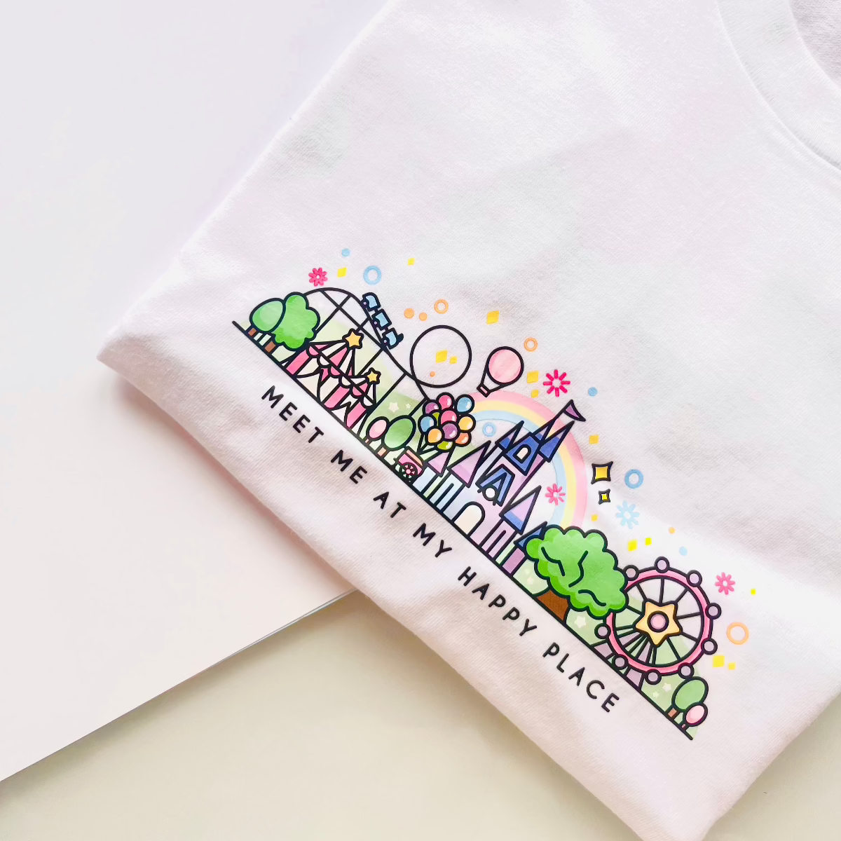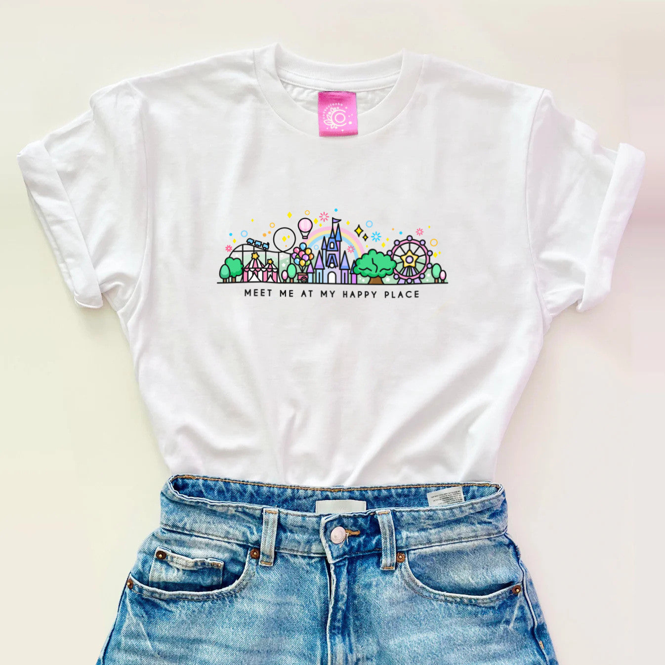 The Happy Place T-Shirt is a magical reminder of what many call the happiest place on Earth. Crafted from soft white cotton with a high-quality illustration, this t-shirt evokes nostalgia for your favourite rides and theme parks. Take a piece of the magic with you wherever you go!