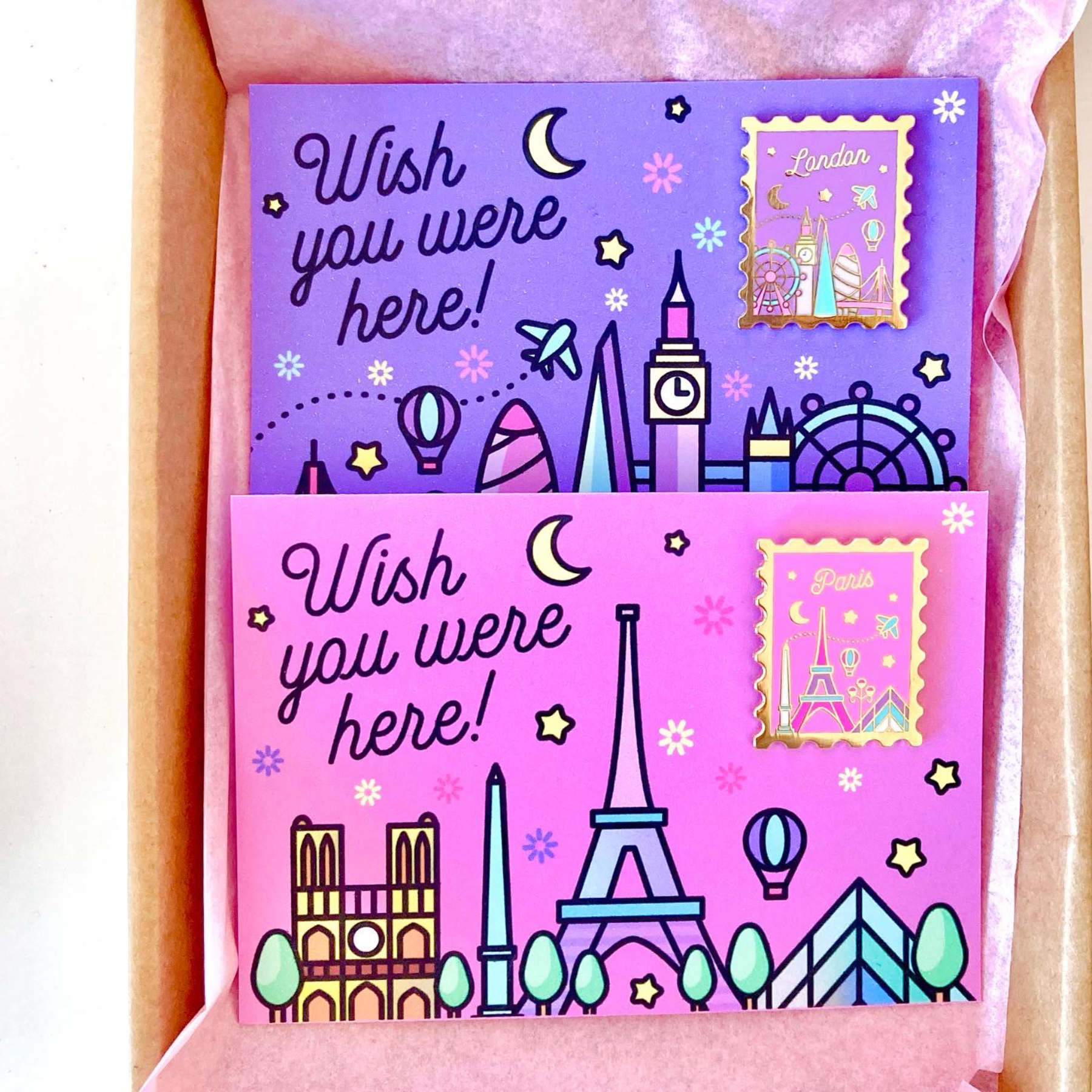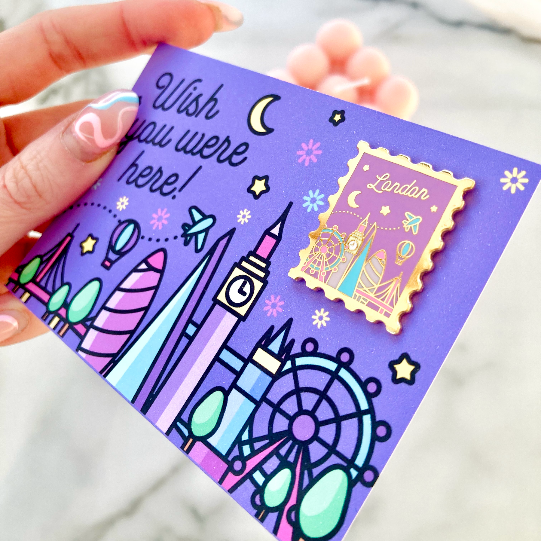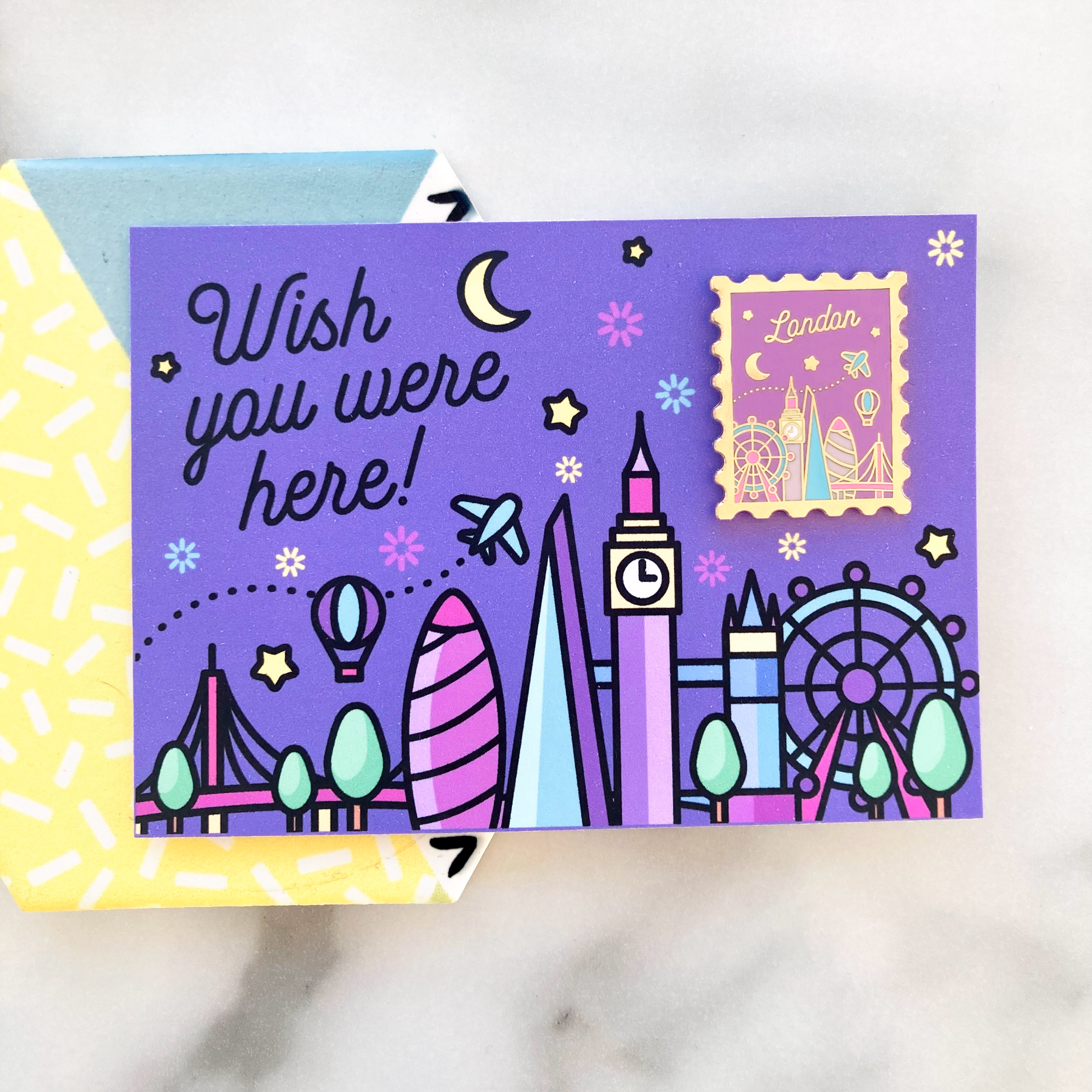 The pin comes complete with a postcard-style backing card stating 'Wish You Were Here!'. Printed on 350gsm, matte-coated card for that extra high-quality feel. Perfect as a gift or as a collectible. We also have Paris, New York and Tokyo pins available in this collection. You can check them out here!