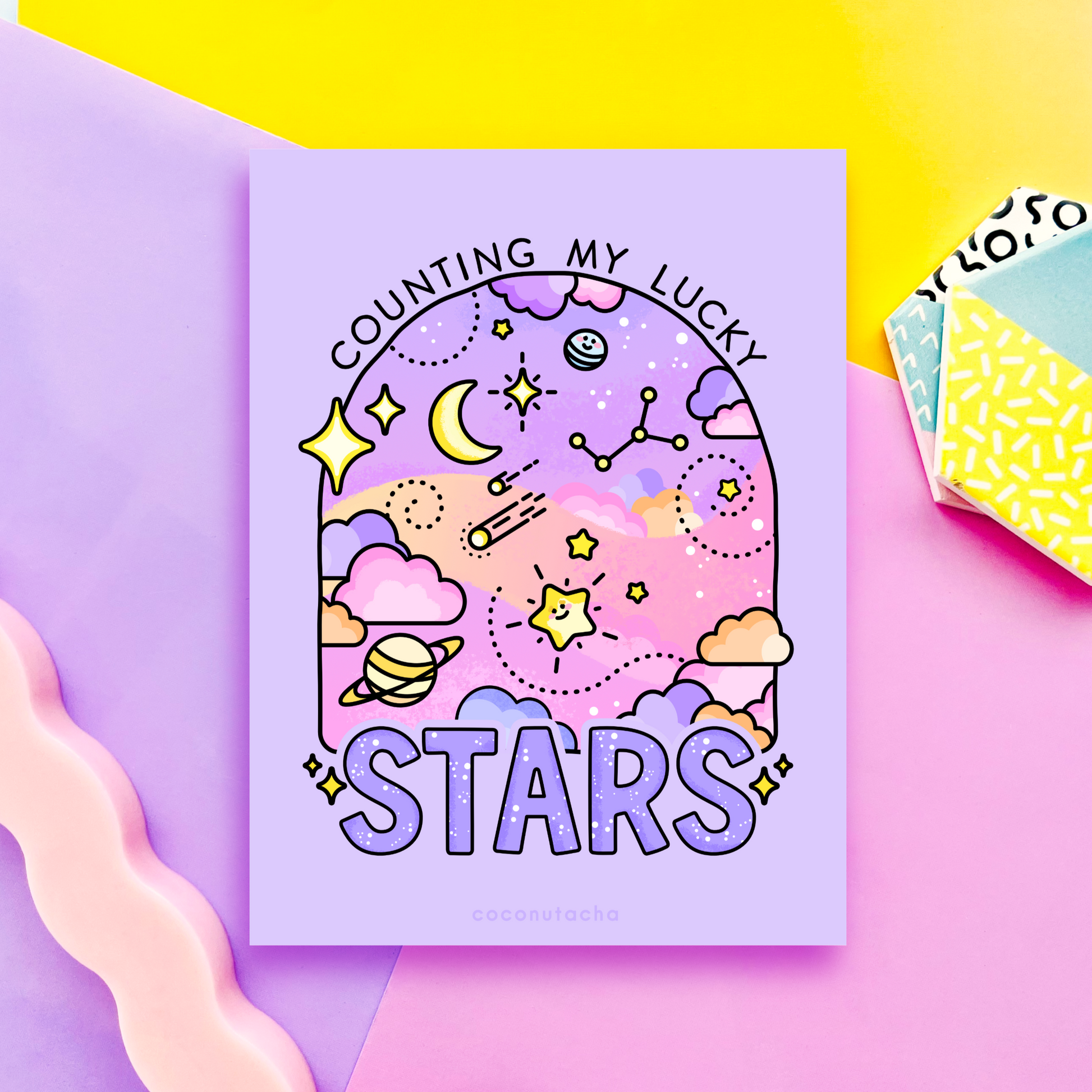Count on your lucky stars with this premium illustrated art print, featuring a cute illustration of all the stars, moons and planets of the night sky.