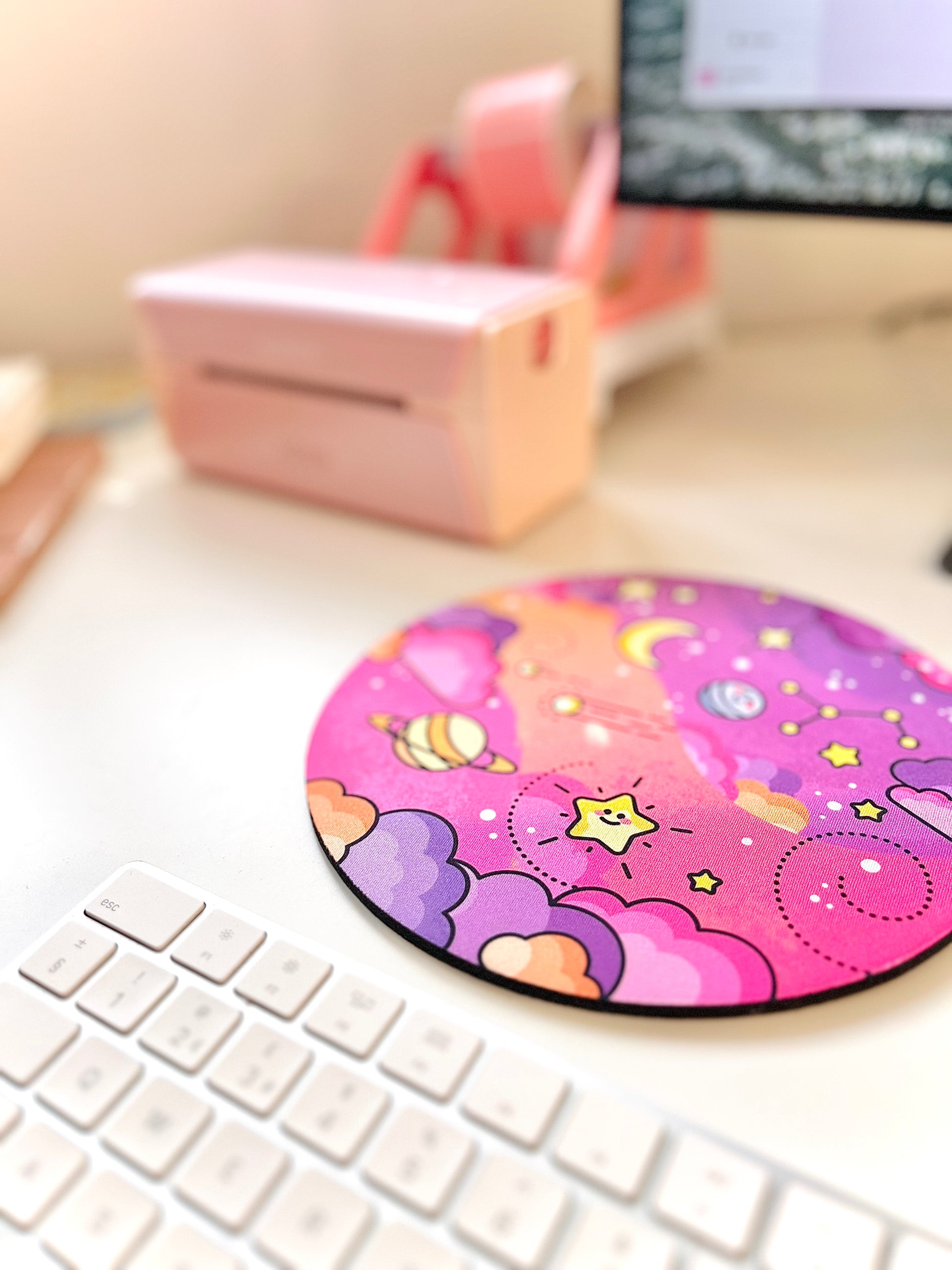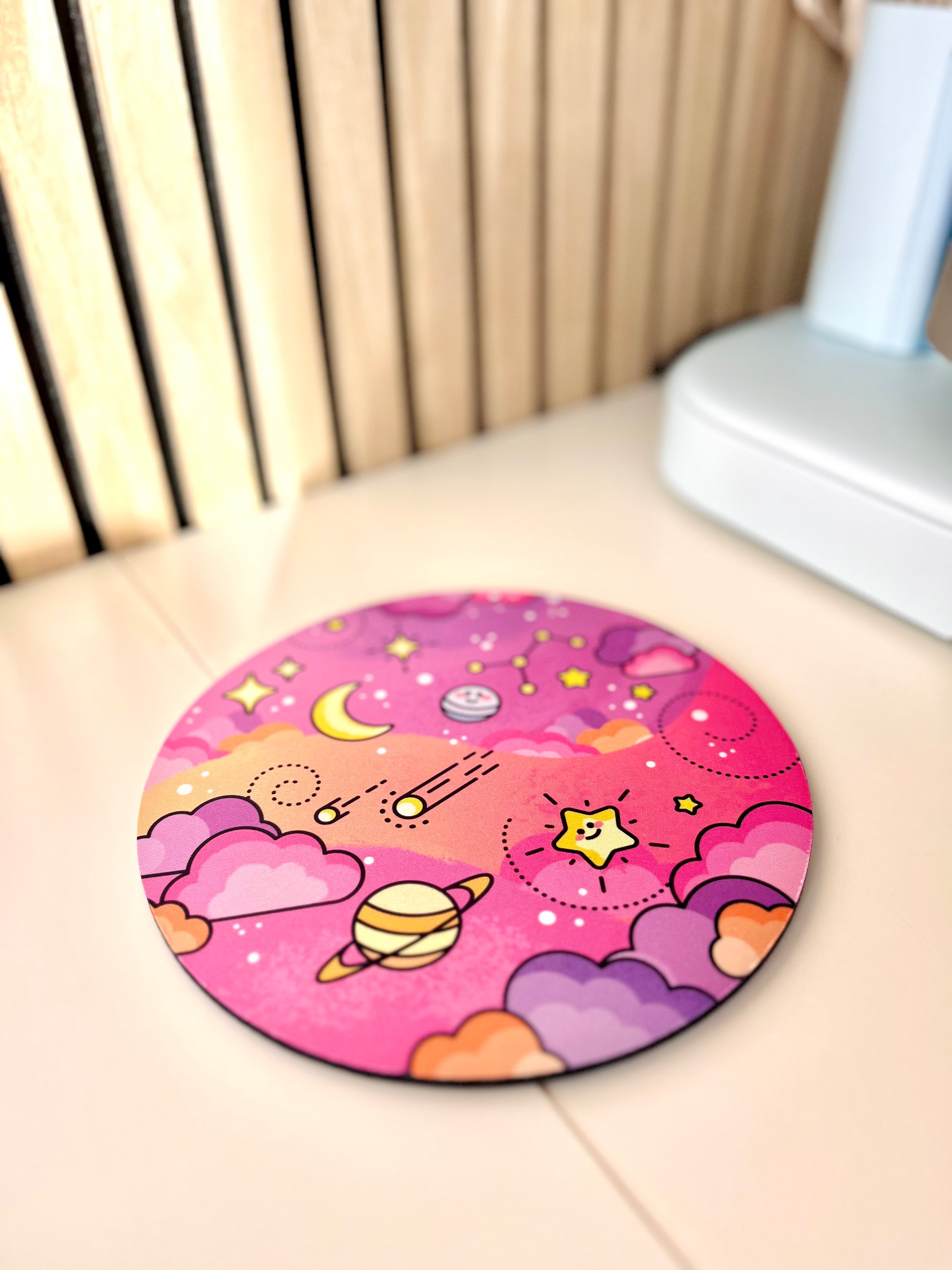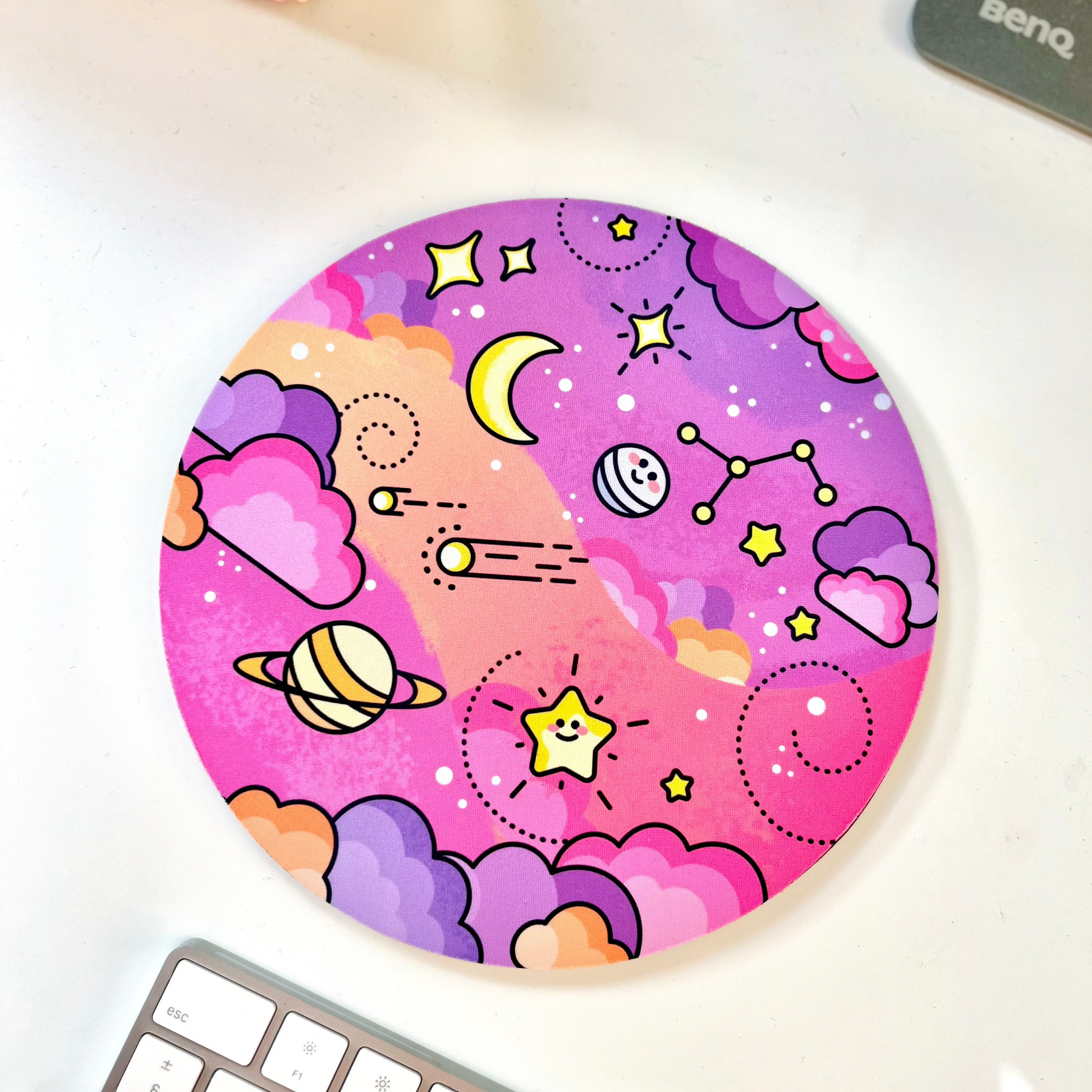 A super vibrant mouse pad, printed with a stunning illustration of a magical night sky, sprinkled with stars, moons and planets. What are you counting your lucky stars for? ✨
