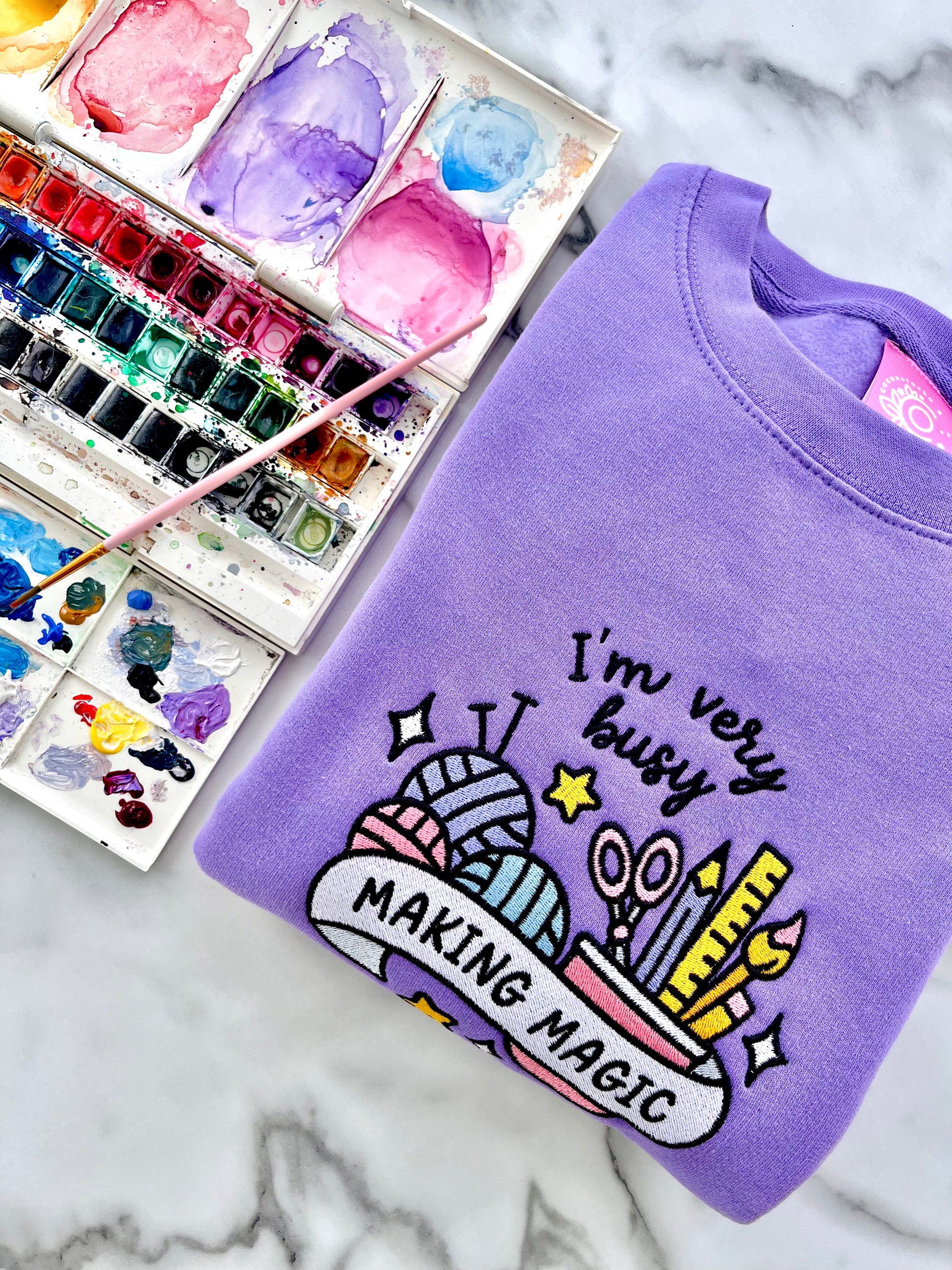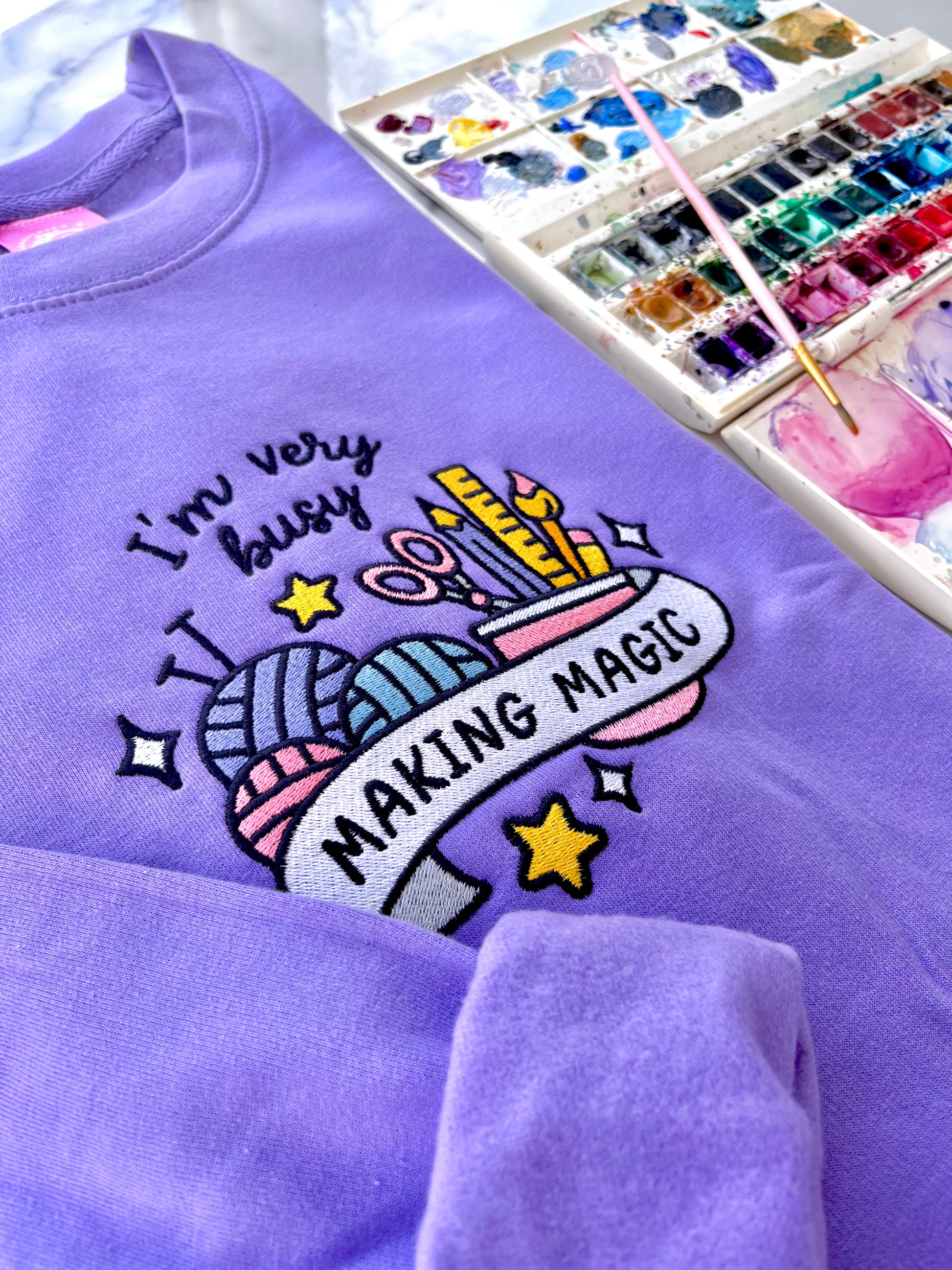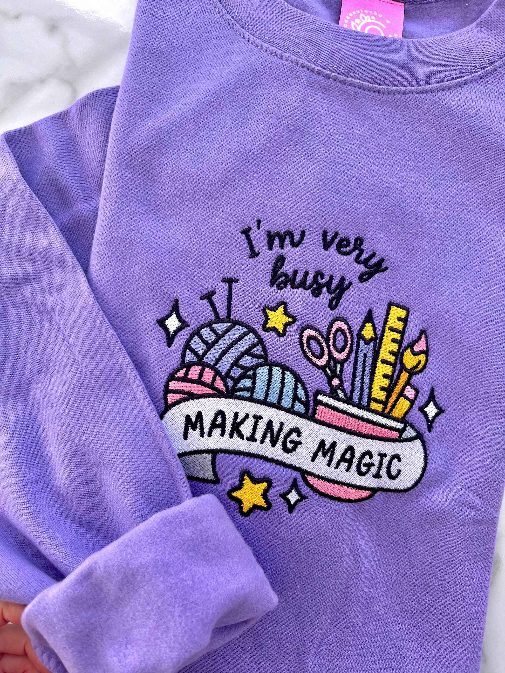 You asked, I made it happen! Introducing the Making Magic embroidered sweater - the cosy lilac companion for all creatives, crafters, and passionate hobbyists 💖