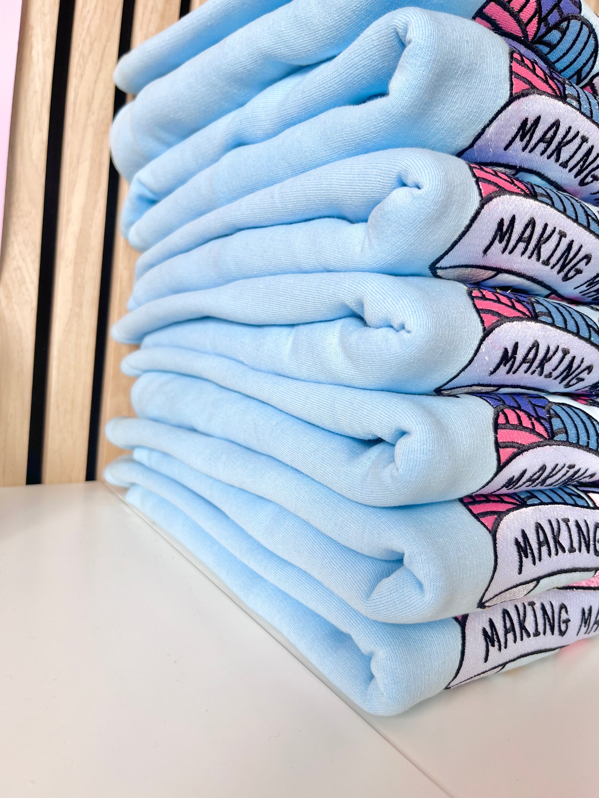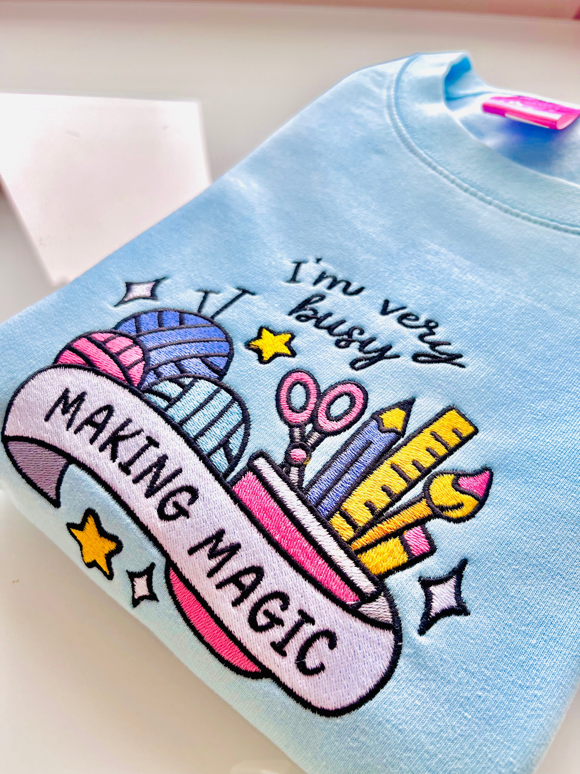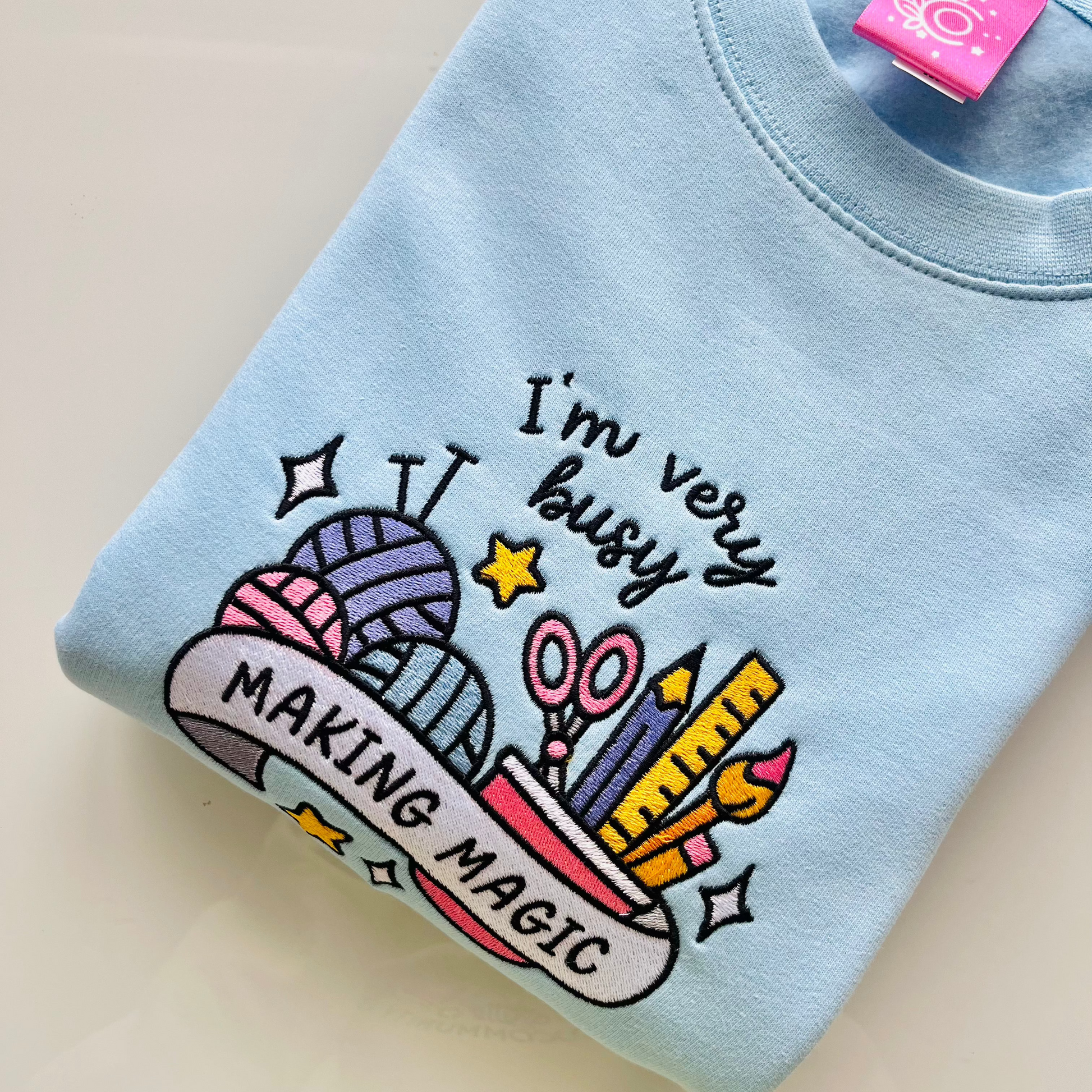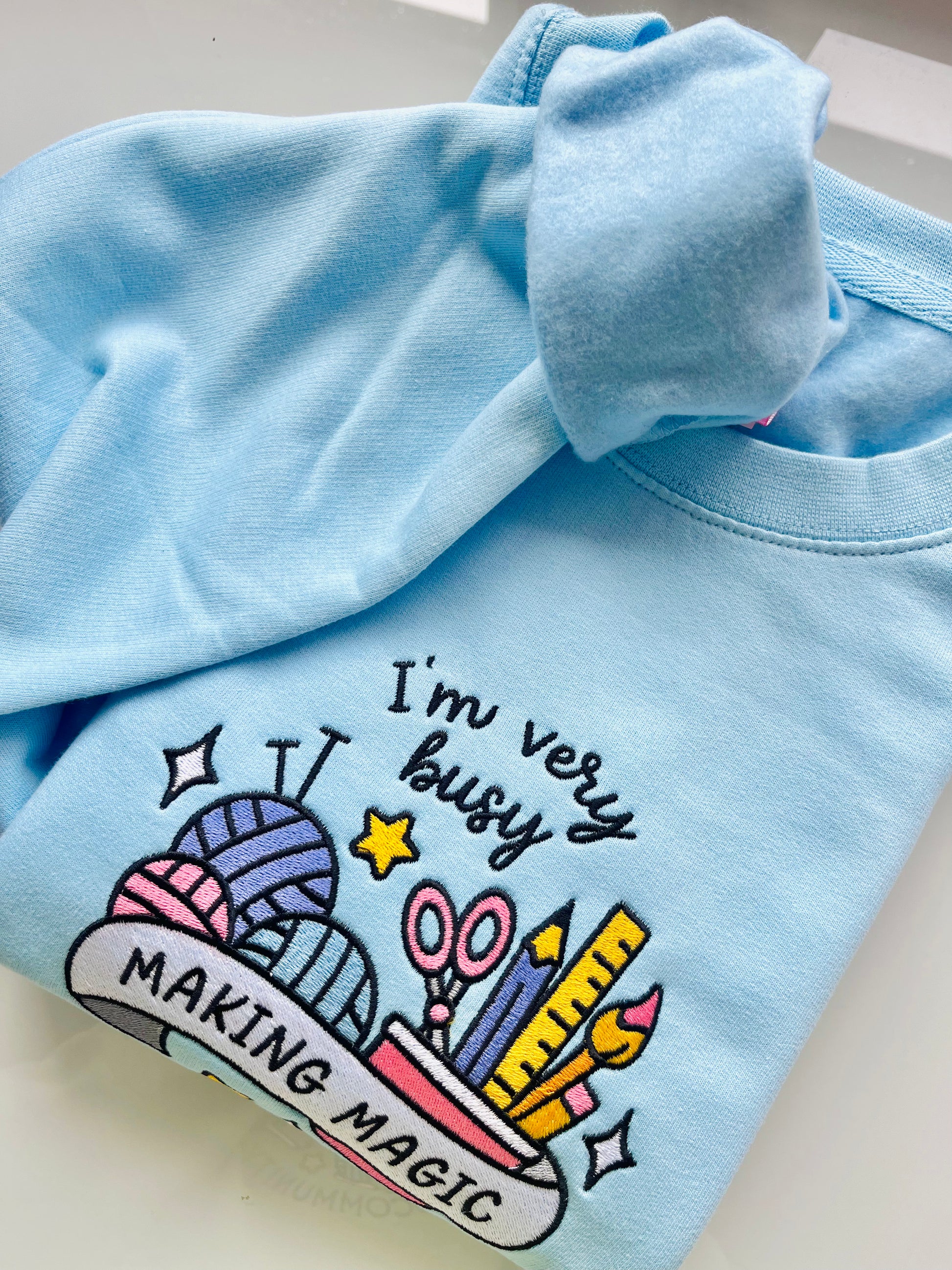 Introducing the Making Magic sweater. Gorgeously embroidered onto an icy blue sweater, featuring all the things us hobbyists and creatives love; wool and thread, pens, pencils and paintbrushes.