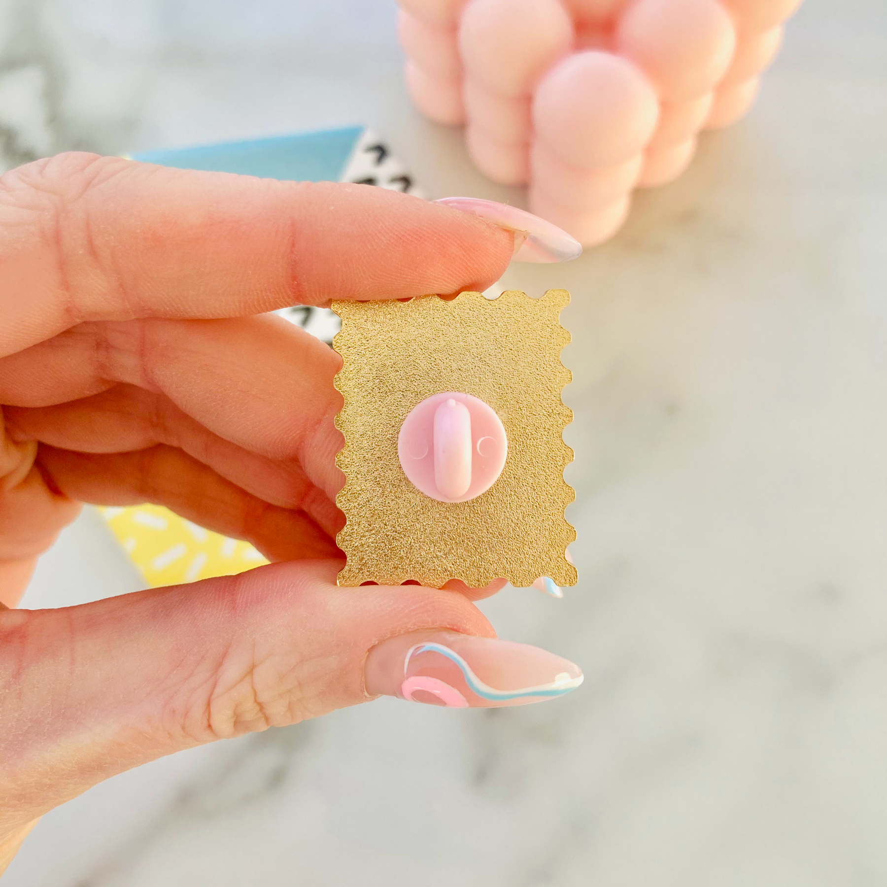 The big apple; New York City! Dreaming of going again or visiting for the first time? This gold-plated, hard-enamel pin perfectly encapsulates the dream of the big city. With some of NYC's most memorable monuments and buildings, including the Statue of Liberty, the Emperor State Building, Chrysler building and more set underneath a starlit sky and crescent moon. The pastel pink rubber clutch is the perfect way to add the pin to your accessories, from clothing to bags, notice boards to purses!