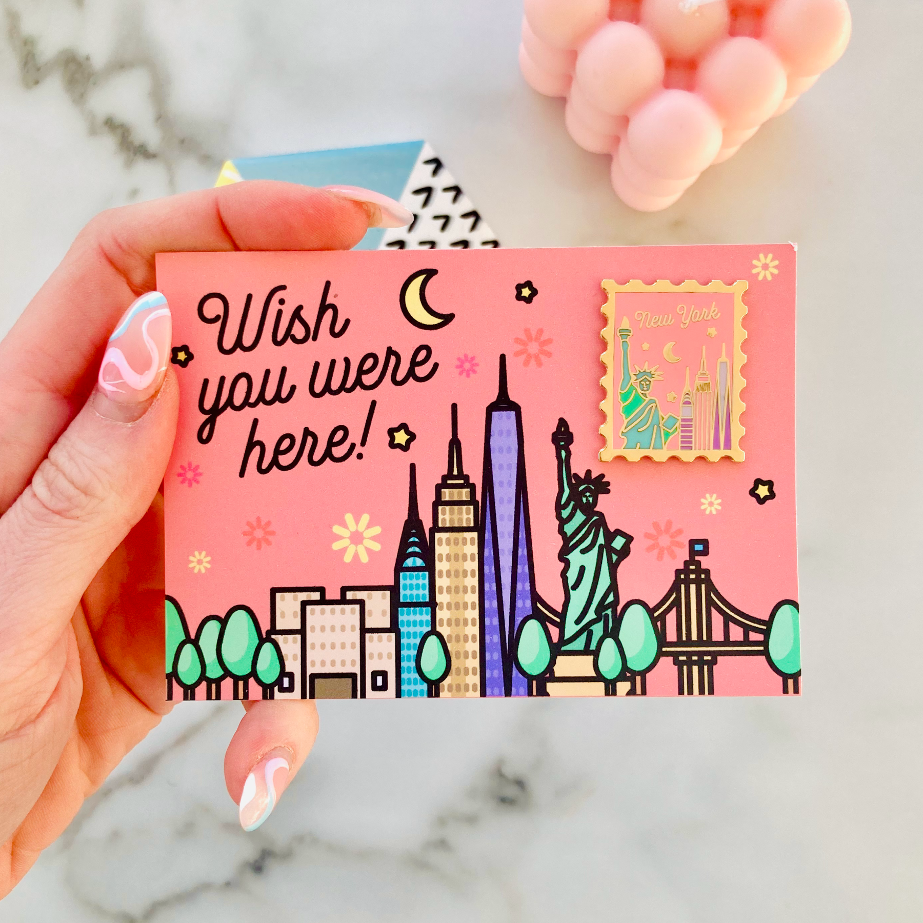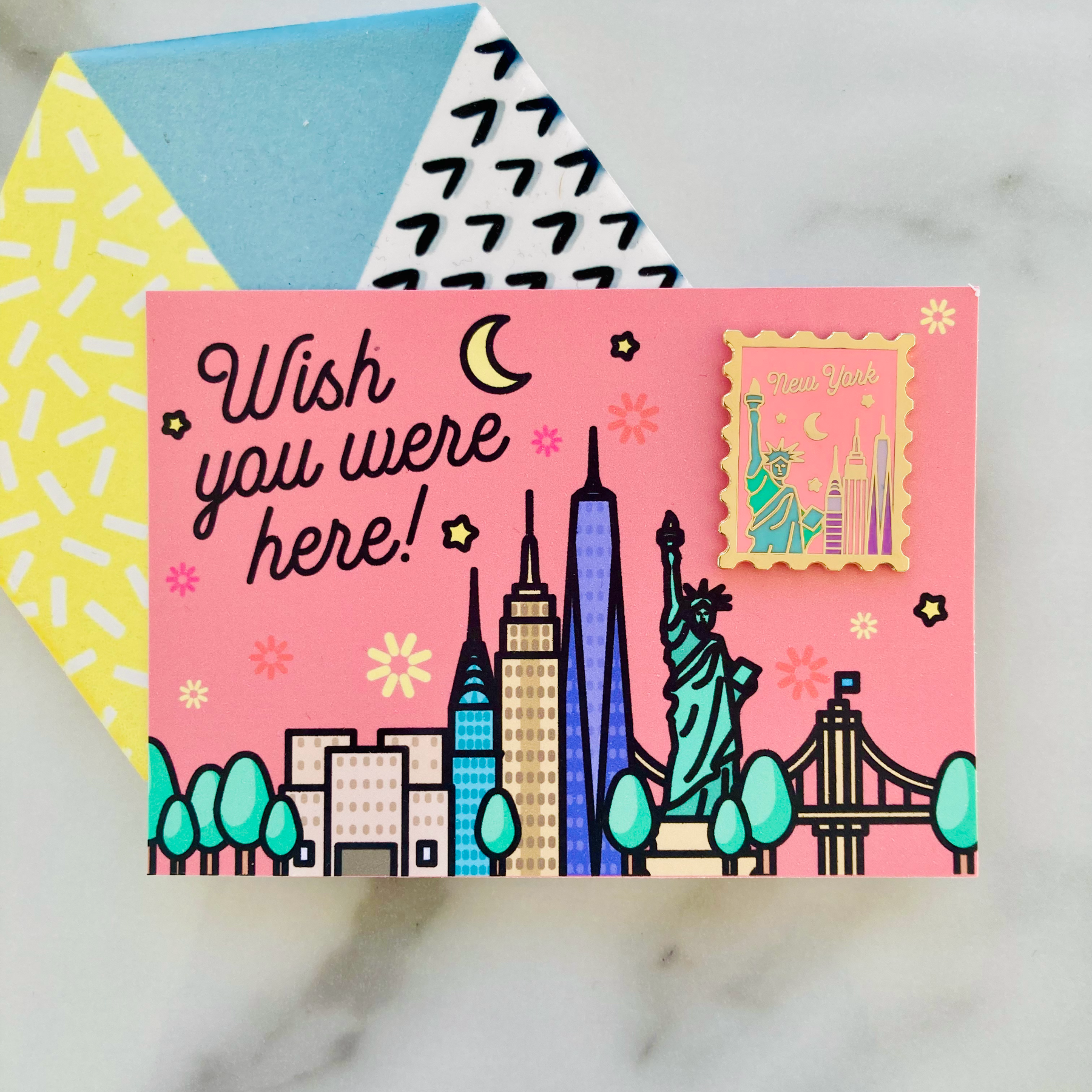 The pin comes complete with a postcard-style backing card stating 'Wish You Were Here!'. Printed on 350gsm, matte-coated card for that extra high-quality feel. Perfect as a gift or as a collectible. We also have London, Paris and Tokyo pins available in this collection. You can check them out here!