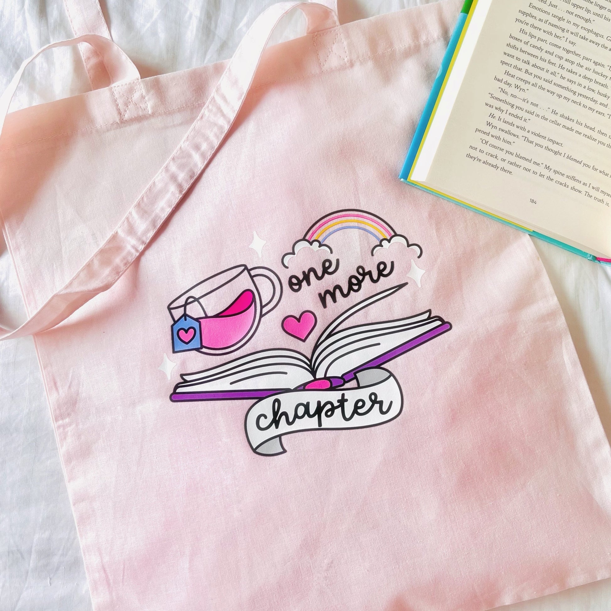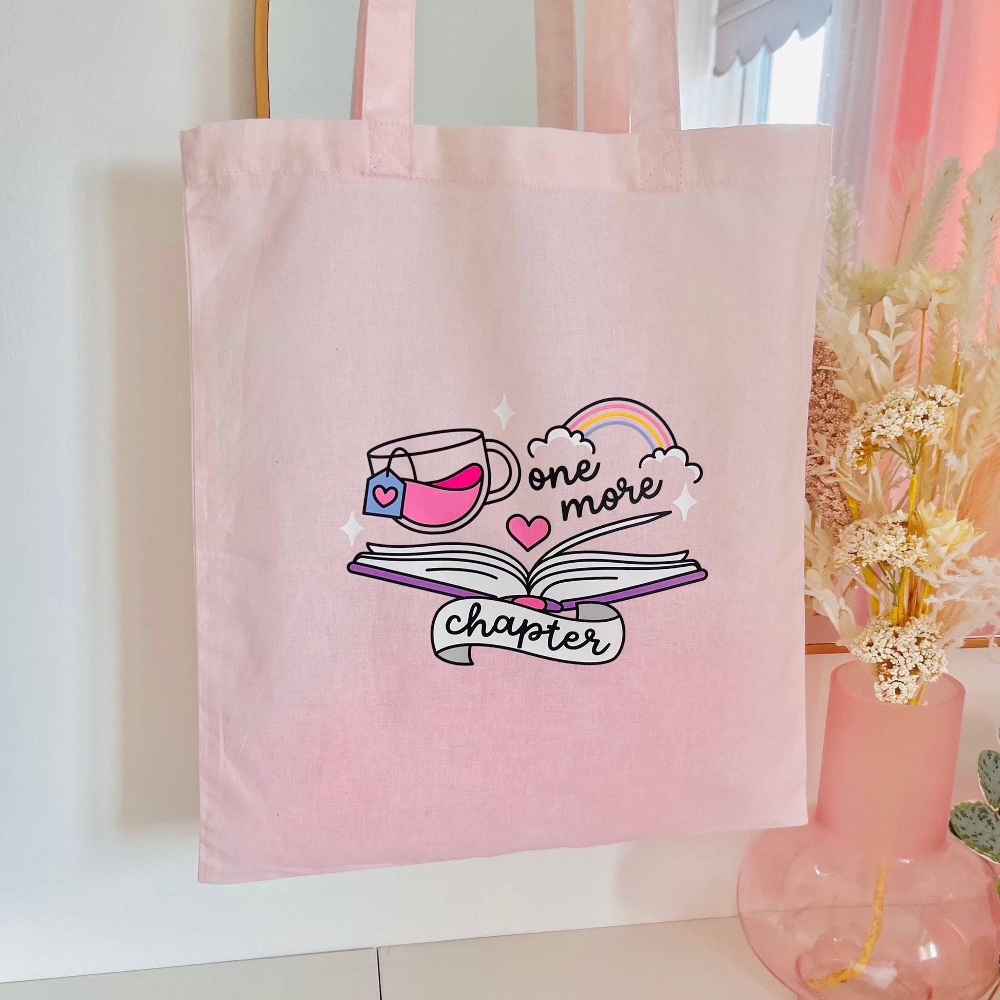 Carry your favourite books, packages, groceries and essentials with this 'One More Chapter' tote bag. Printed with a super cute illustration featuring a book, cosy hot drink and colourful rainbow on a pale pink tote bag.