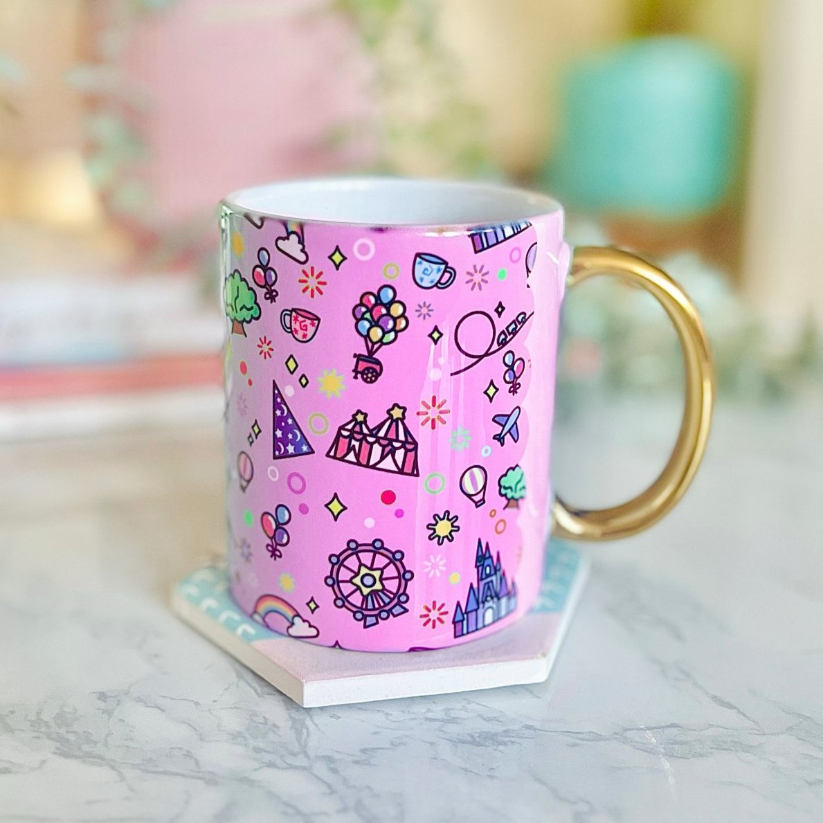Enjoy your favourite hot beverage in this pink and gold Happy Place mug! Featuring a gorgeous pattern of fun, whimsical icons from rainbow and ferris wheels, to magical princess castles, colourful balloons and adrenalin-fuelled rollercoasters.