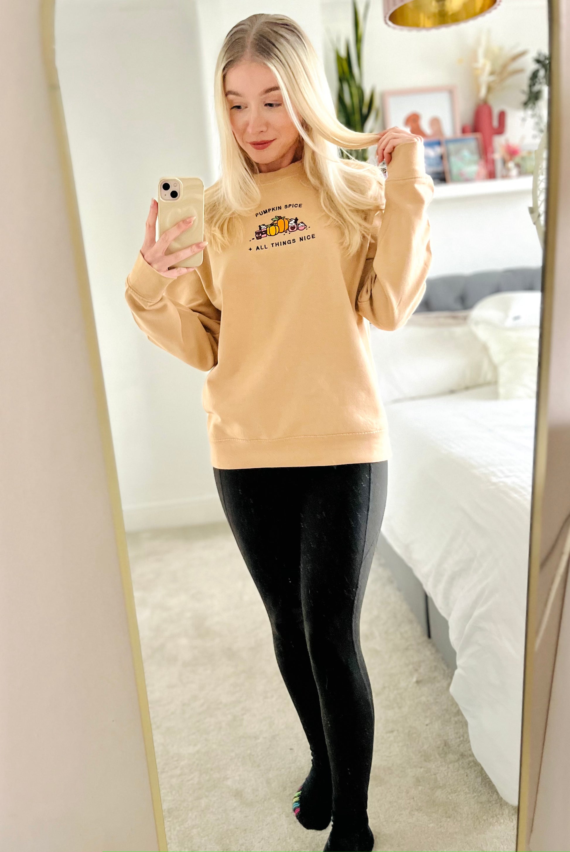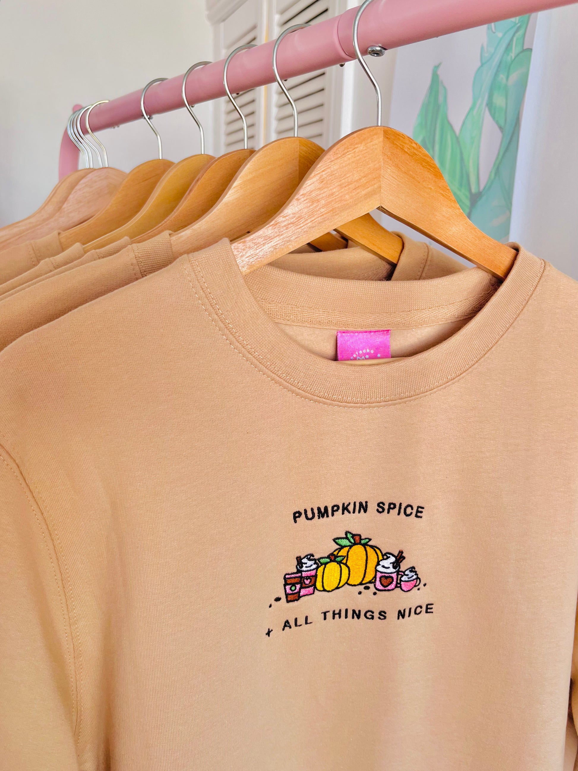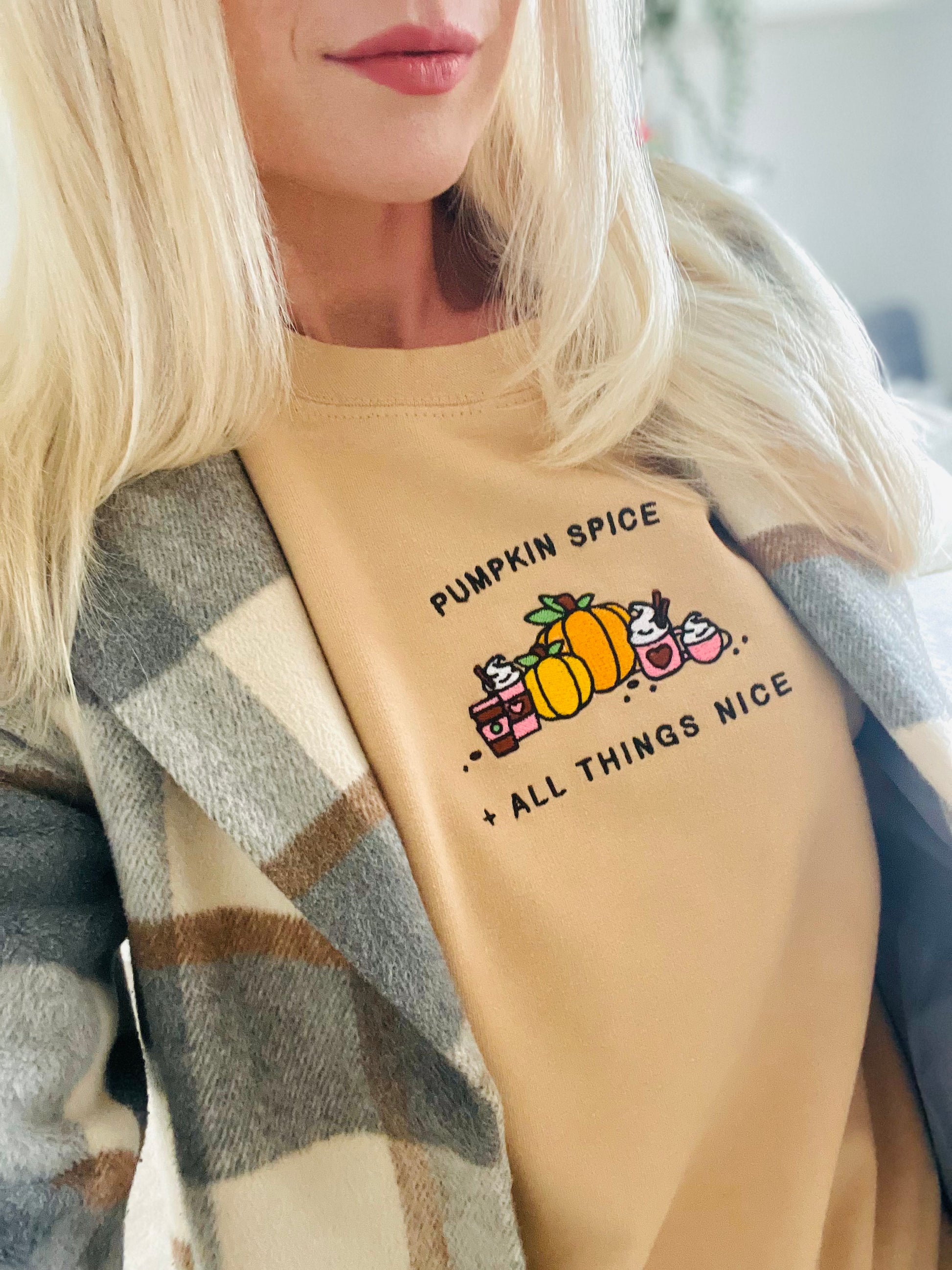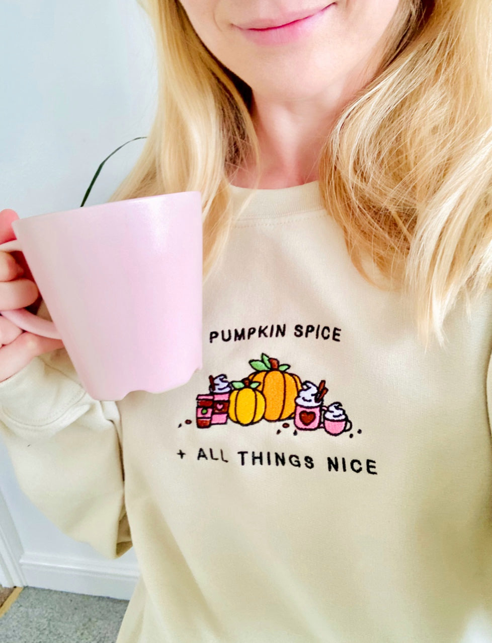 A dreamy, super soft sweater embroidered with autumnal pumpkins, hot chocolates and pumpkin spice lattes on a neutral, sand coloured sweater. The ultimate cosy jumper for this autumn and winter season!