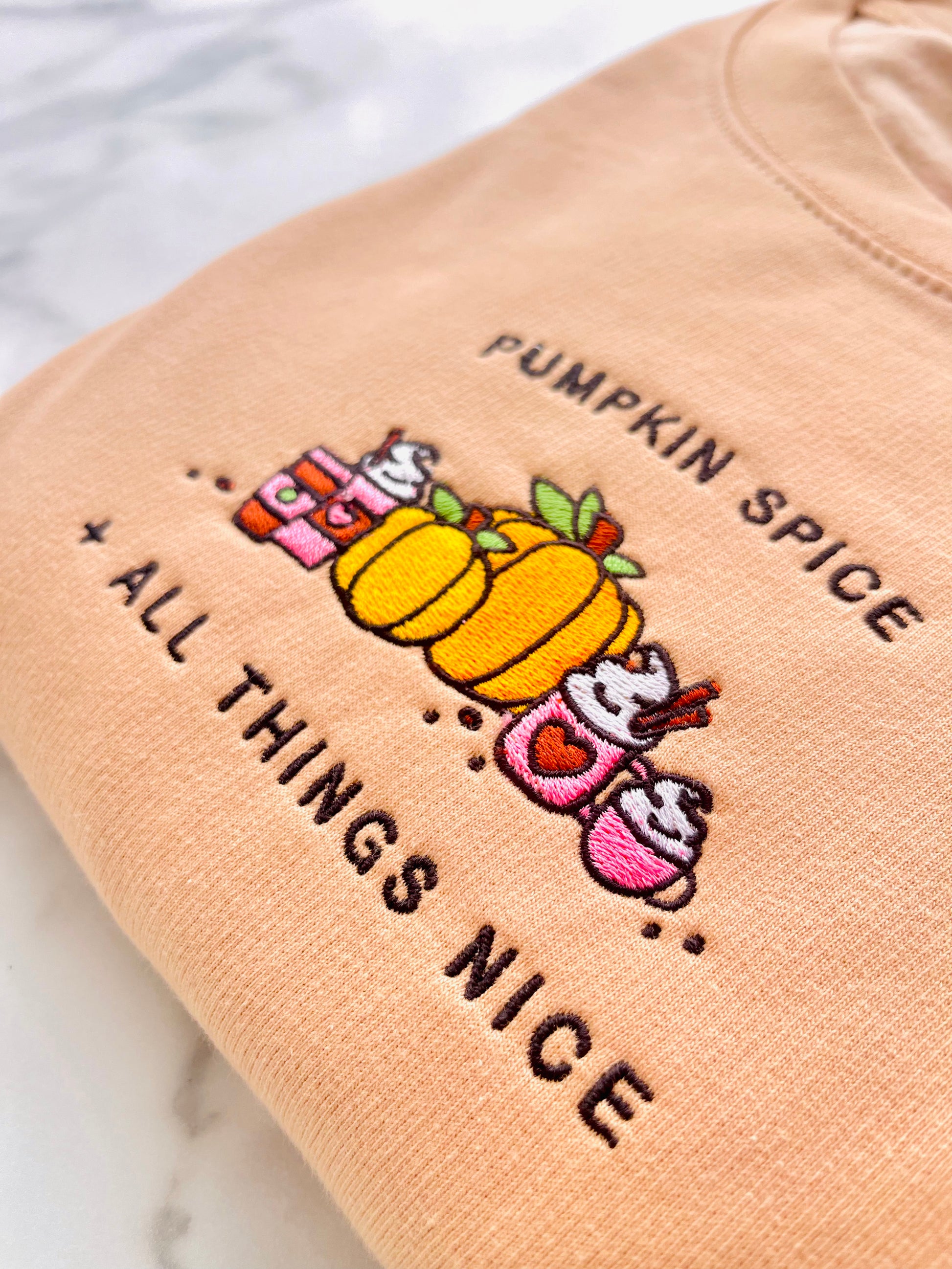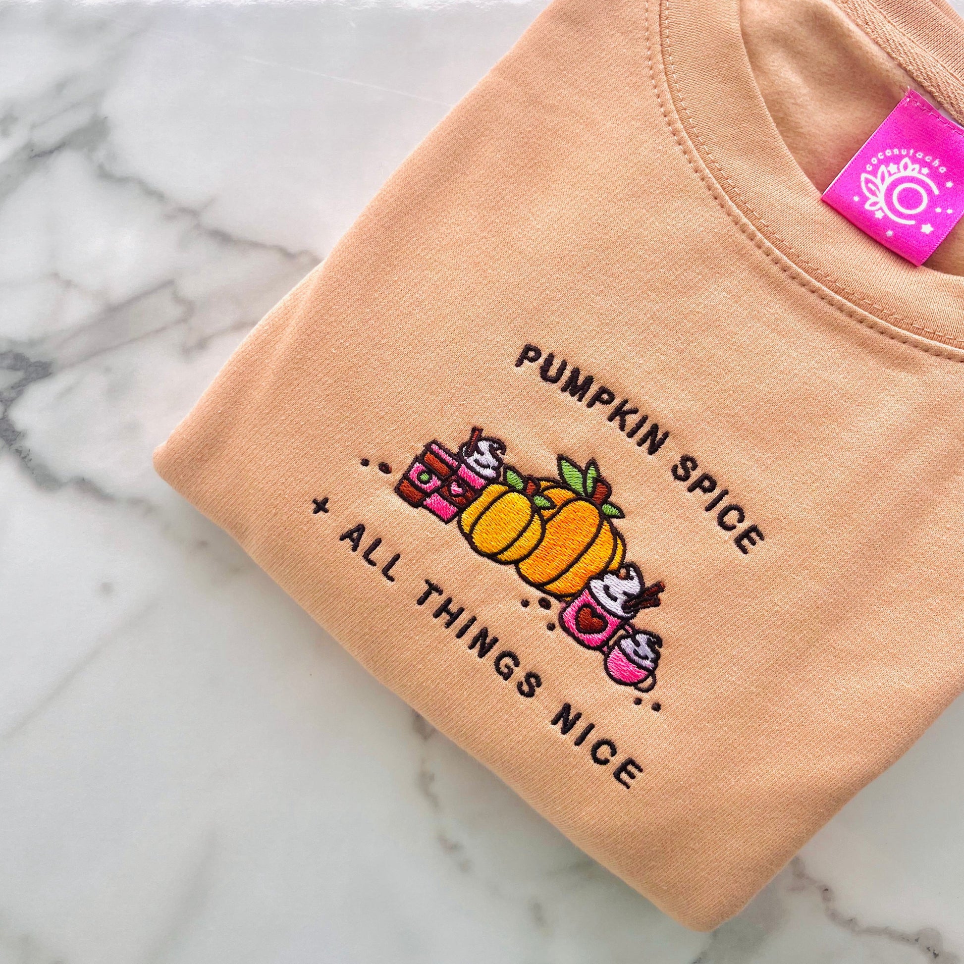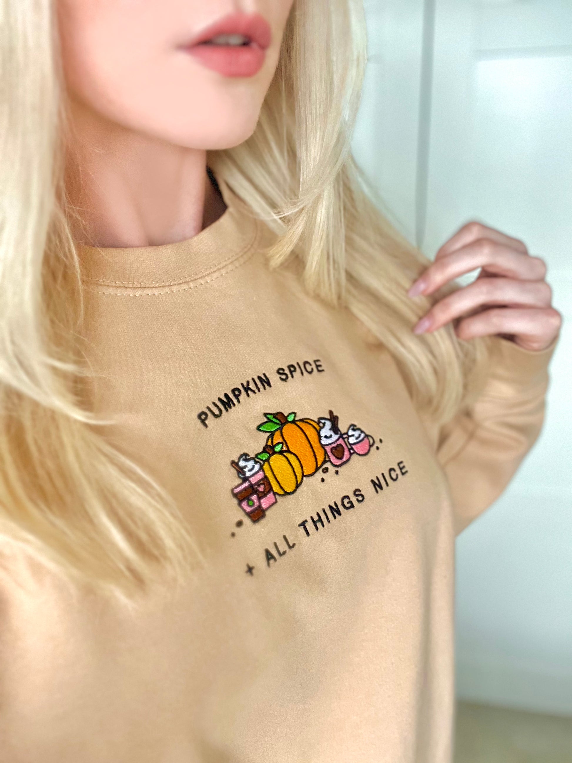 A dreamy, super soft sweater embroidered with autumnal pumpkins, hot chocolates and pumpkin spice lattes on a neutral, sand coloured sweater. The ultimate cosy jumper for this autumn and winter season!