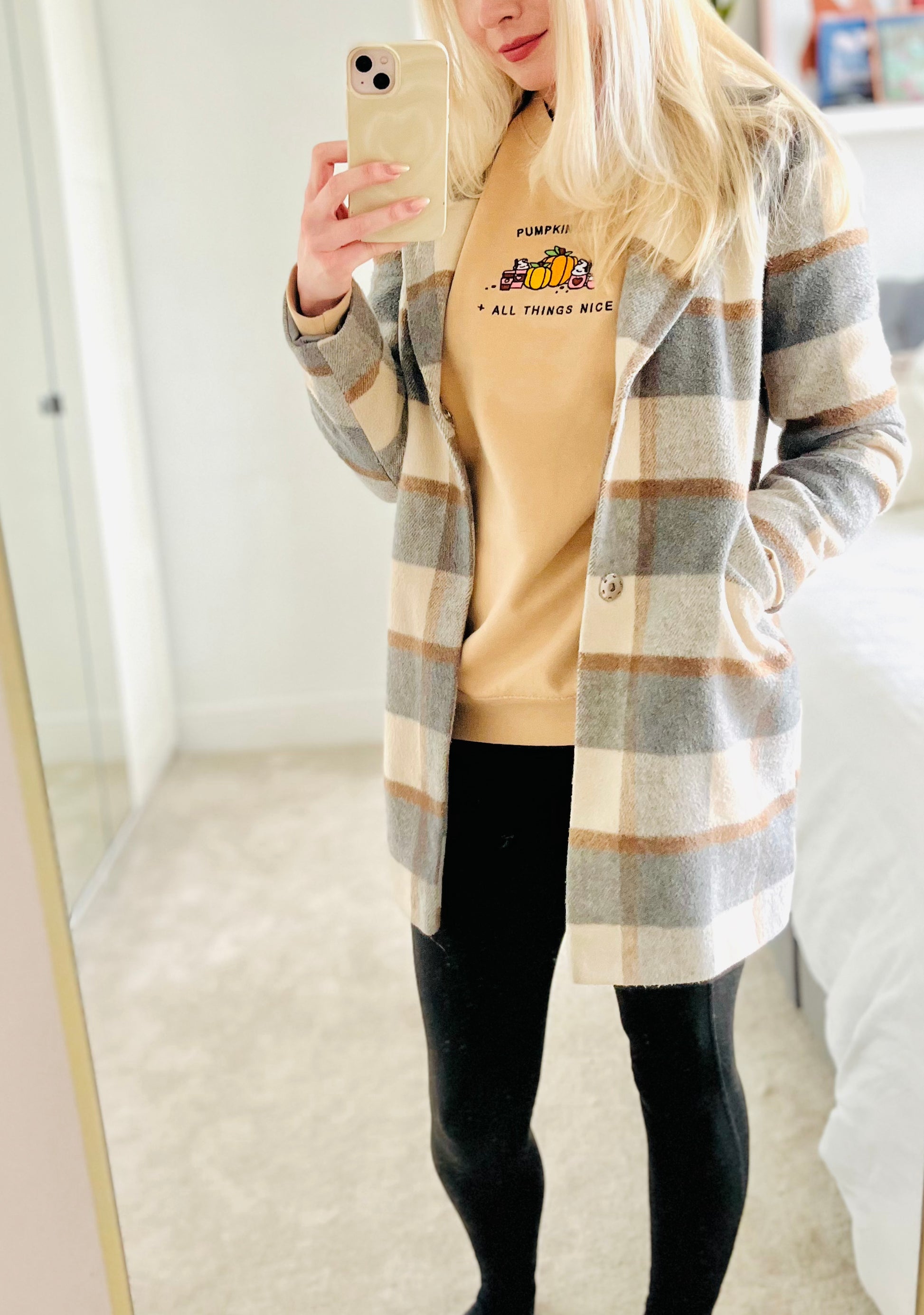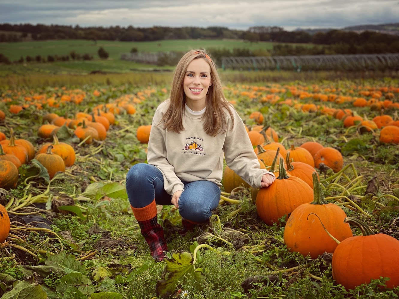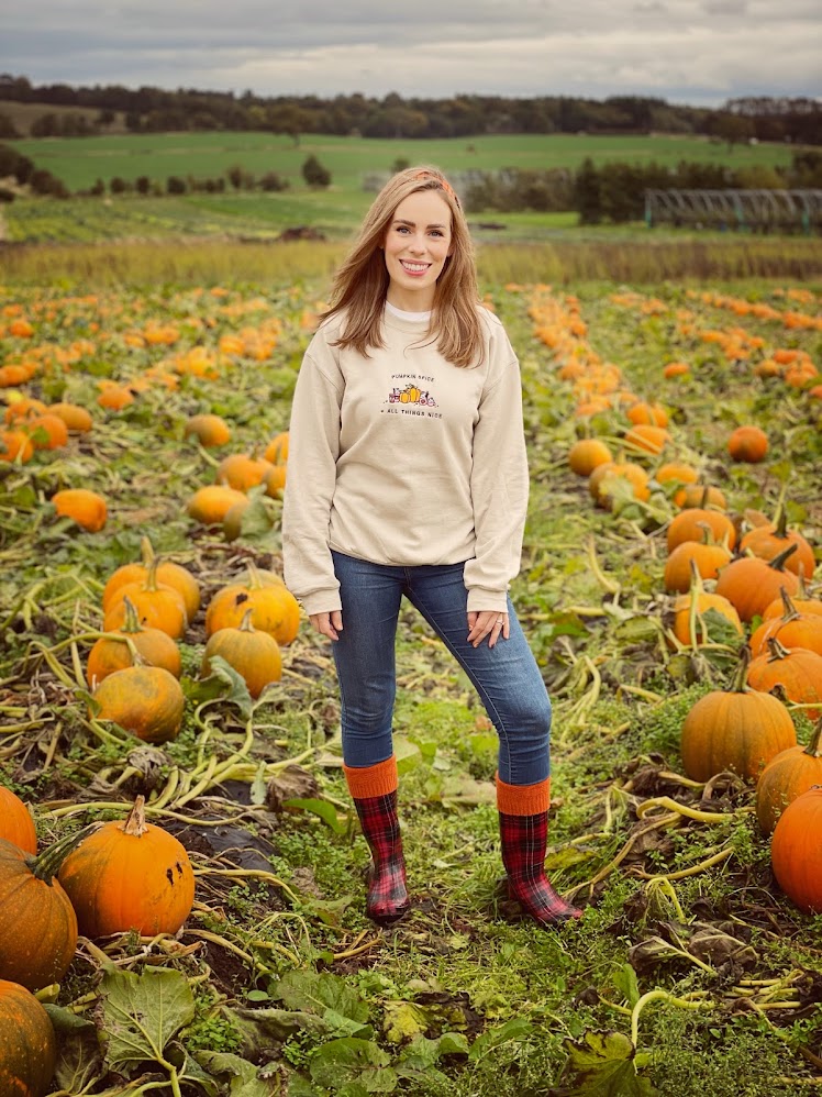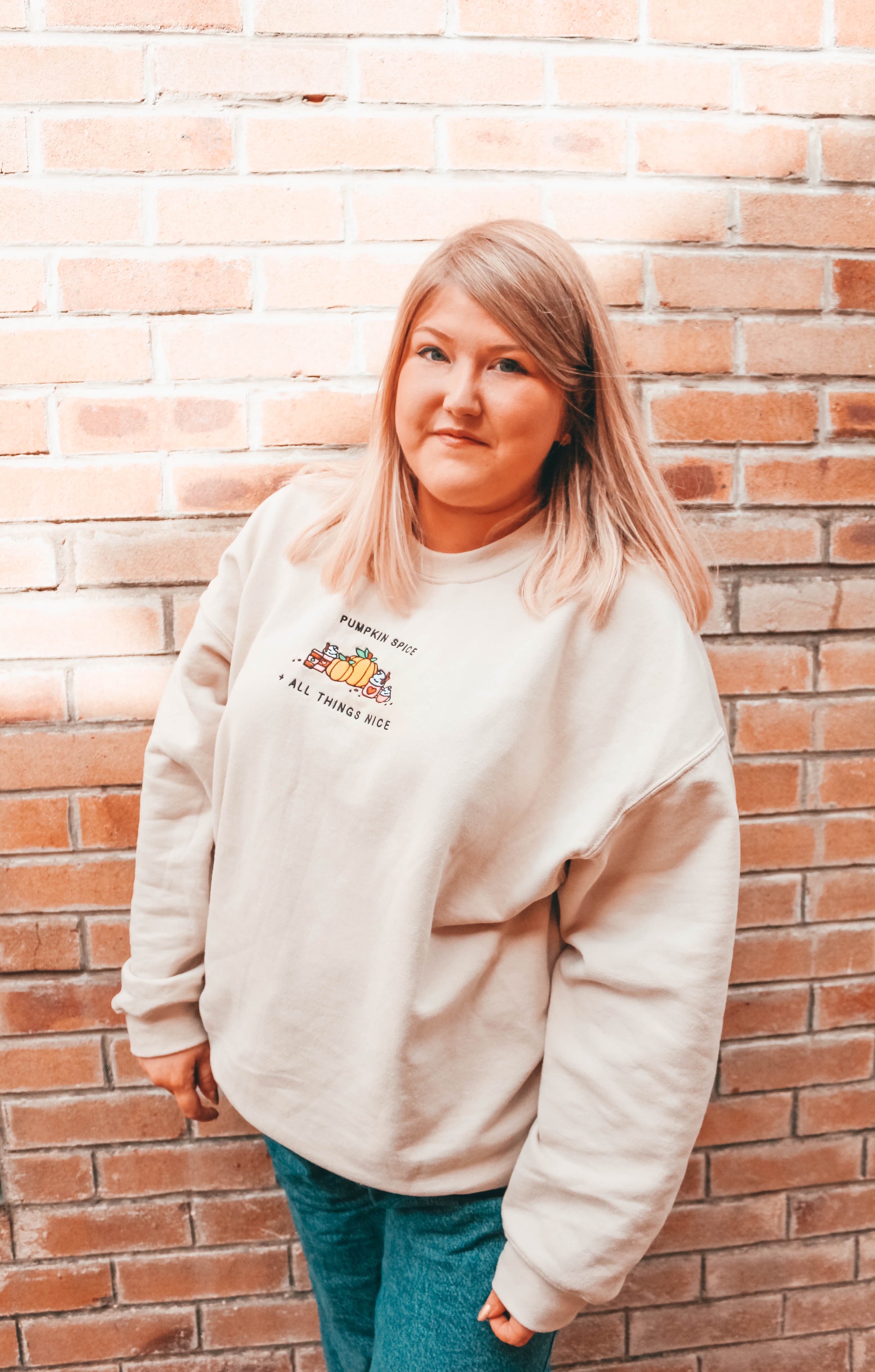 A dreamy, super soft sweater embroidered with autumnal pumpkins, hot chocolates and pumpkin spice lattes on a neutral, sand coloured sweater. The ultimate cosy jumper for this autumn and winter season!
