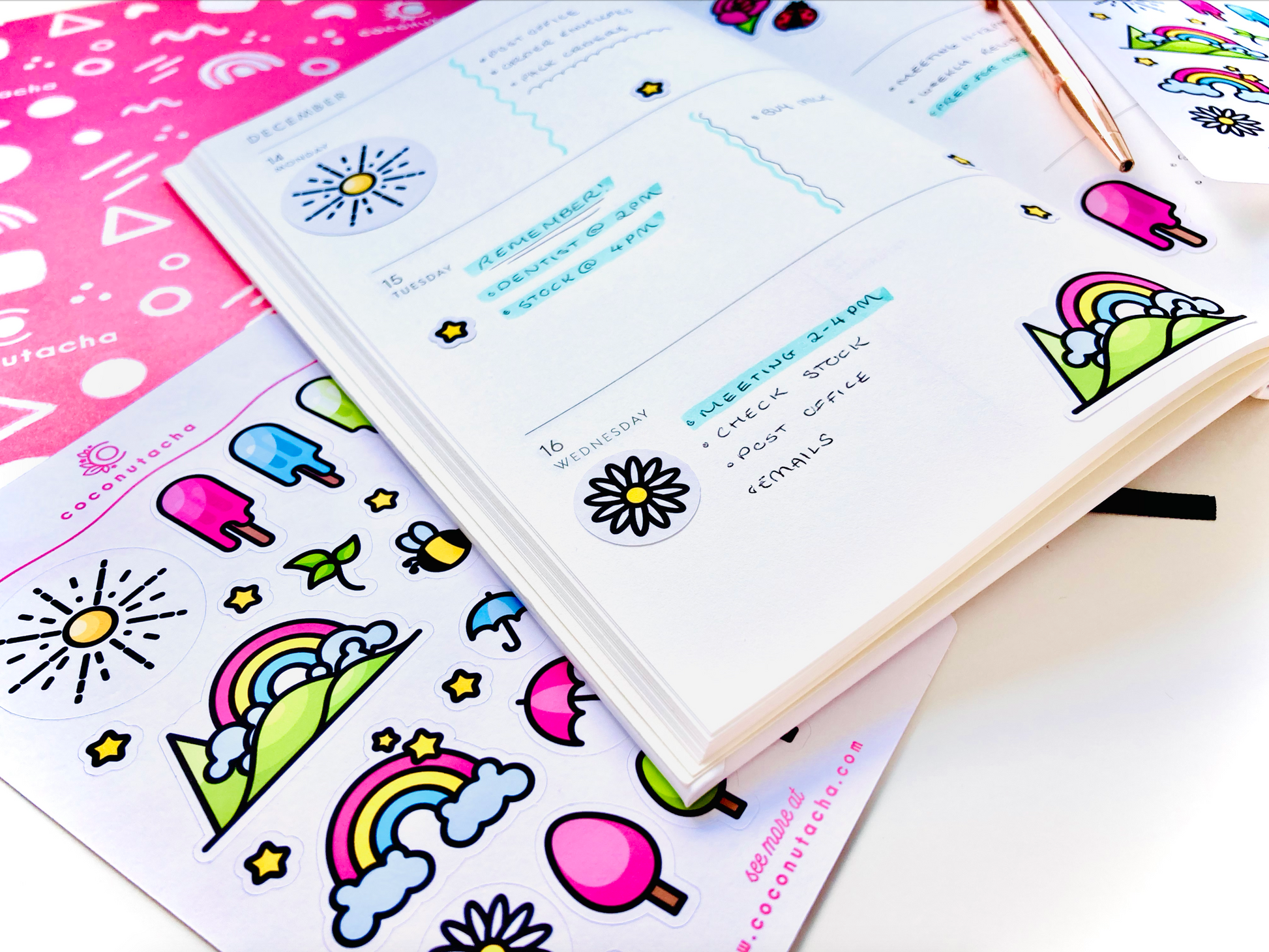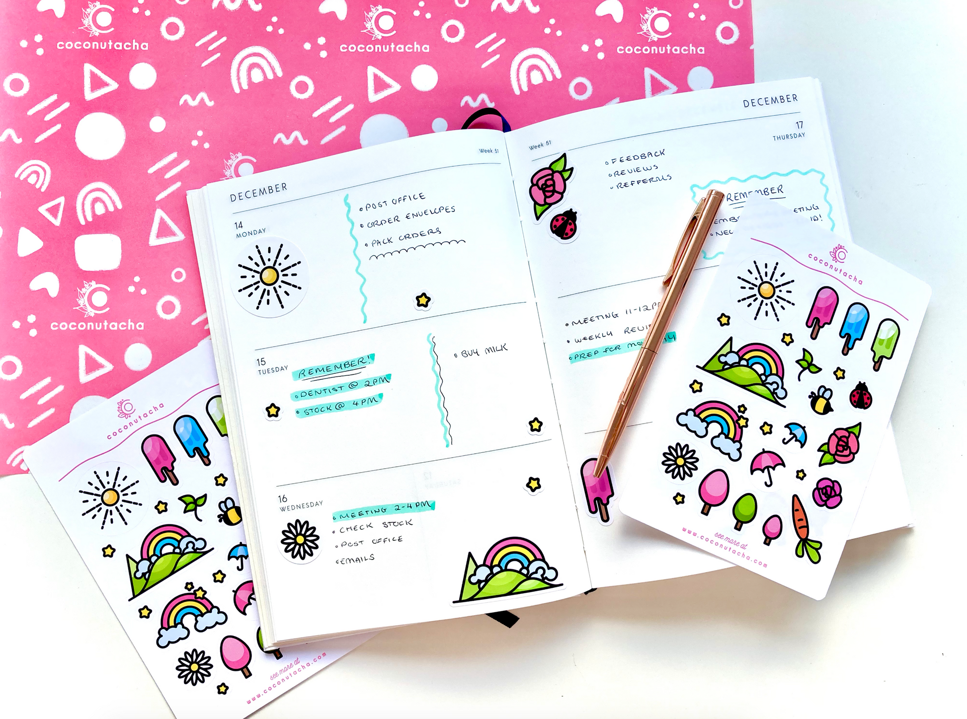 Complete with cute ice cream stickers, flowers, bees, rainbows and more.
