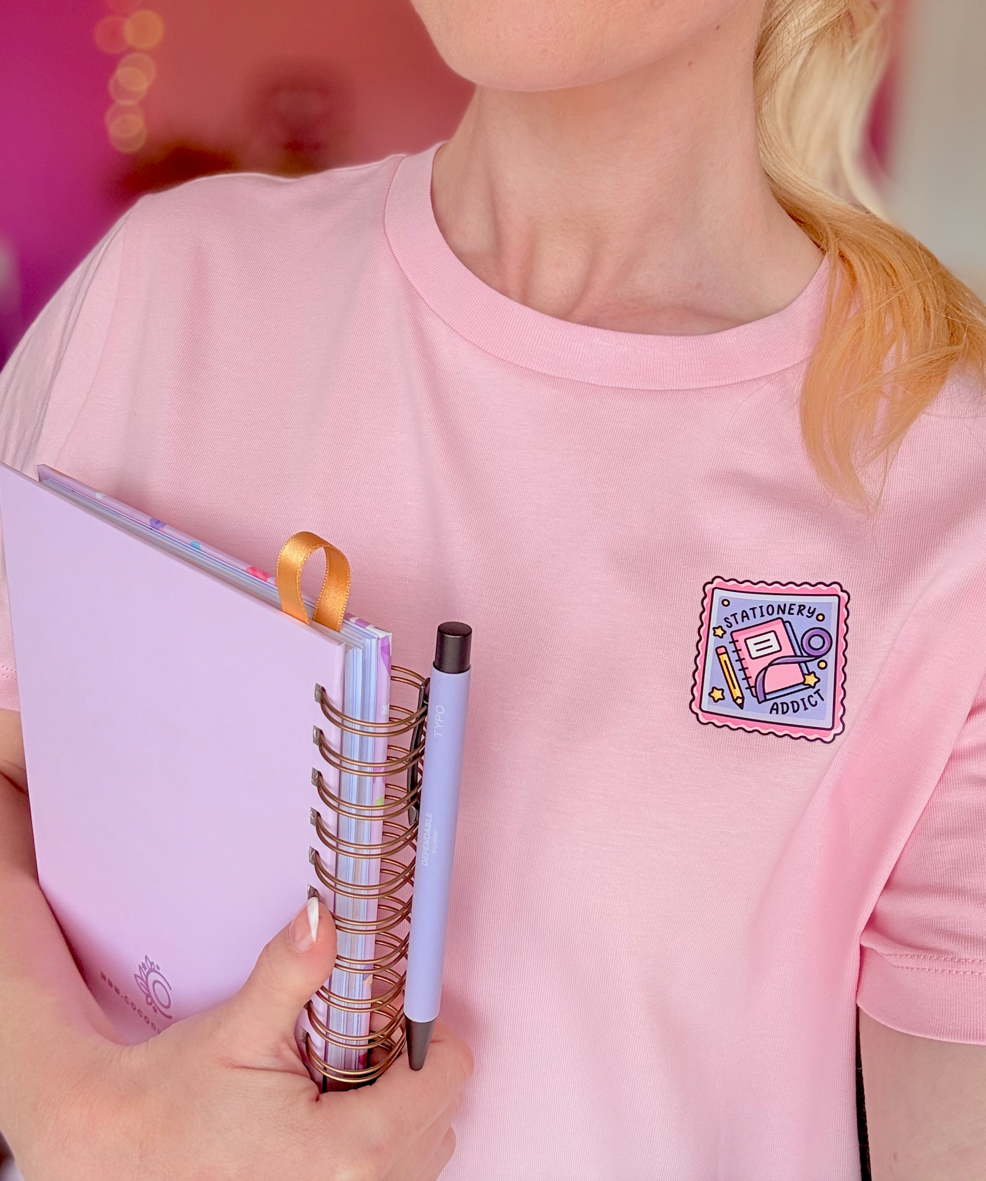 - Candyfloss pink with a stamp-style ‘Stationery Addict’ illustration on the left pocket