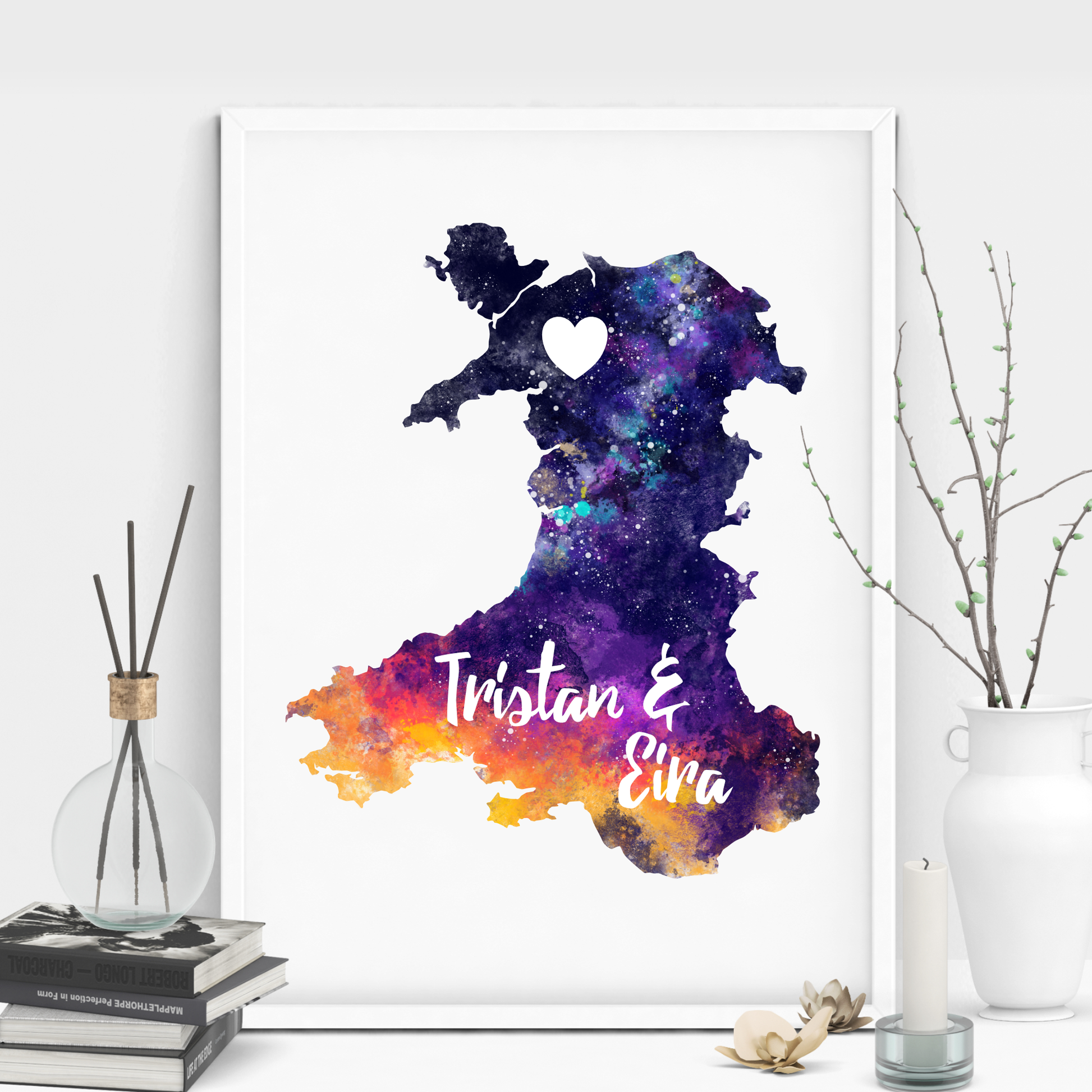 A lovely watercolour silhouette of the map of Wales, set underneath the romantic starry sky. Customise your print to feature you and your partner's names, a personalised message, anything you want! The heart features over the place that you call Home, so can be moved anywhere on the map.